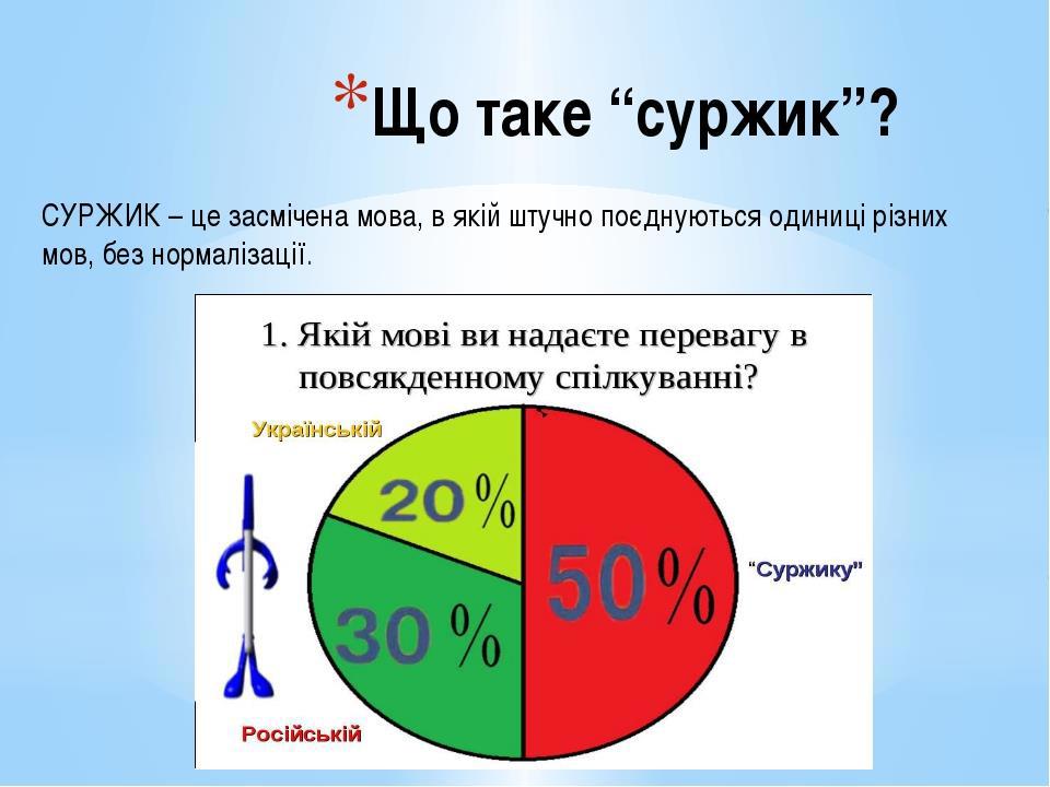 Что такое суржик? Лингвисты не имеют однозначного мнения на этот счет. Обычно под этим термином понимают смесь украинского и русского языков, однако иногда суржиком называют контактную систему между любыми двумя наречиями. Самостоятельным языком суржик не считается, он ближе даже к жаргону, в какой-то мере - развитому. Хотя в основе термина всегда лежит «хлеб из муки смеси разных видов зерна, например, пшеницы и ржи».