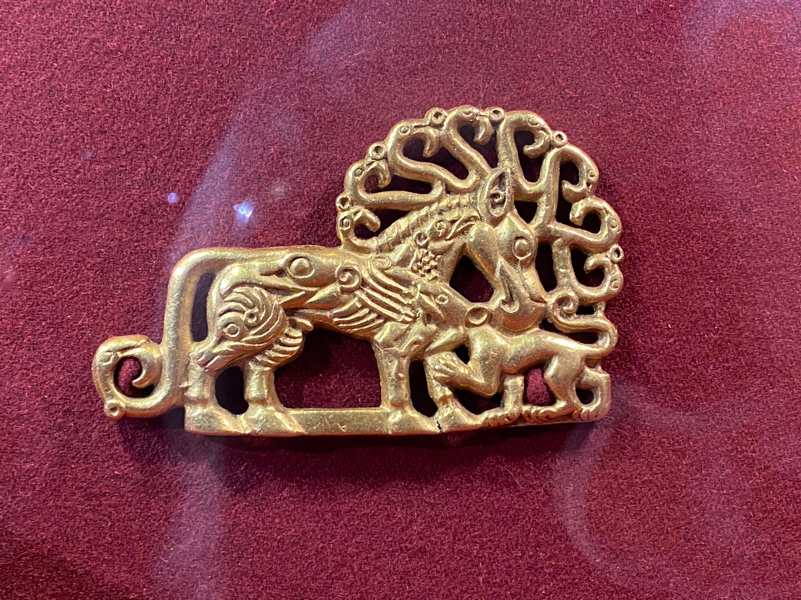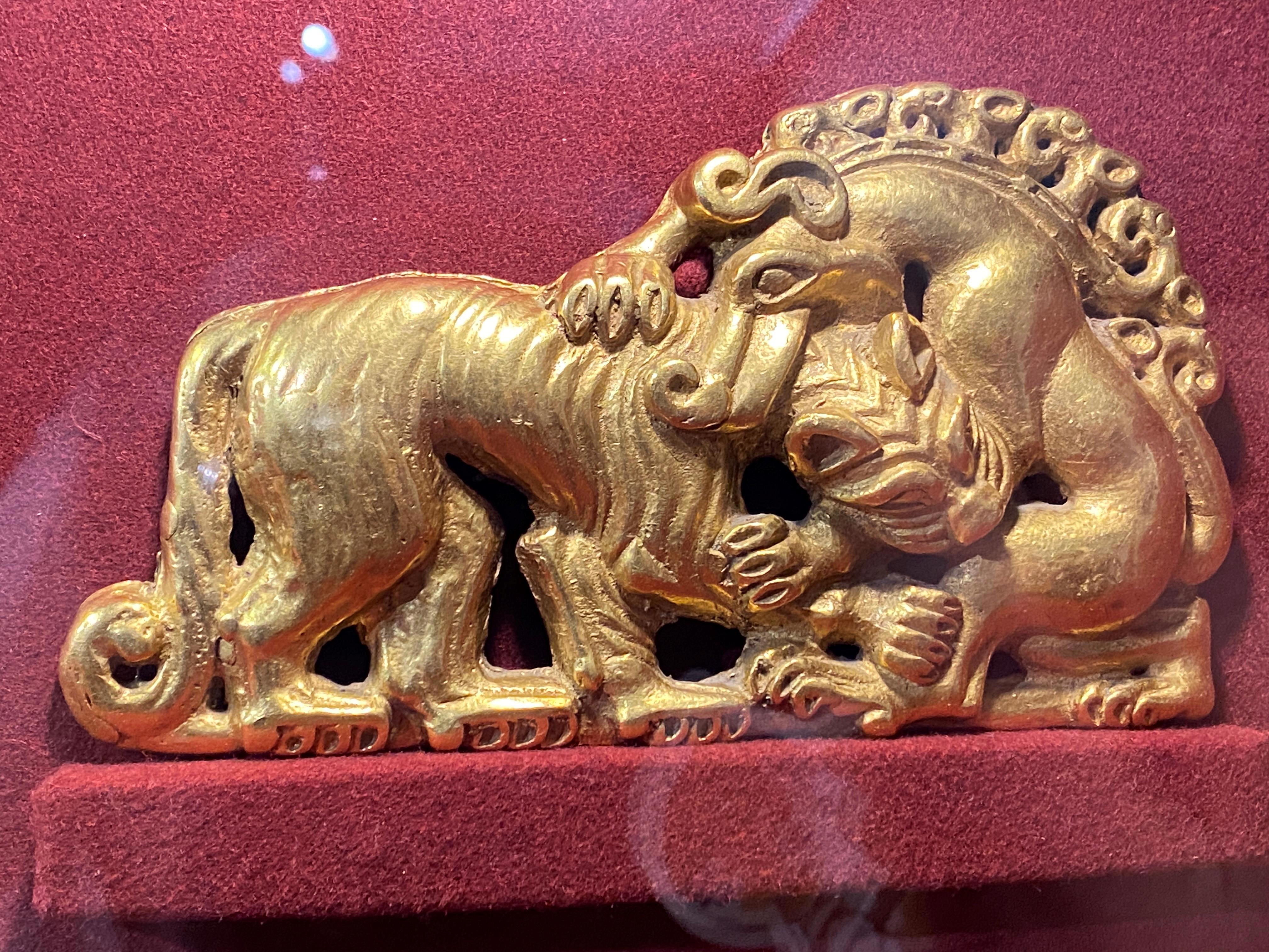 На выставке мне попалась забавная золотая пластина - "схватка тигра с фантастической собакой (или драконом)".