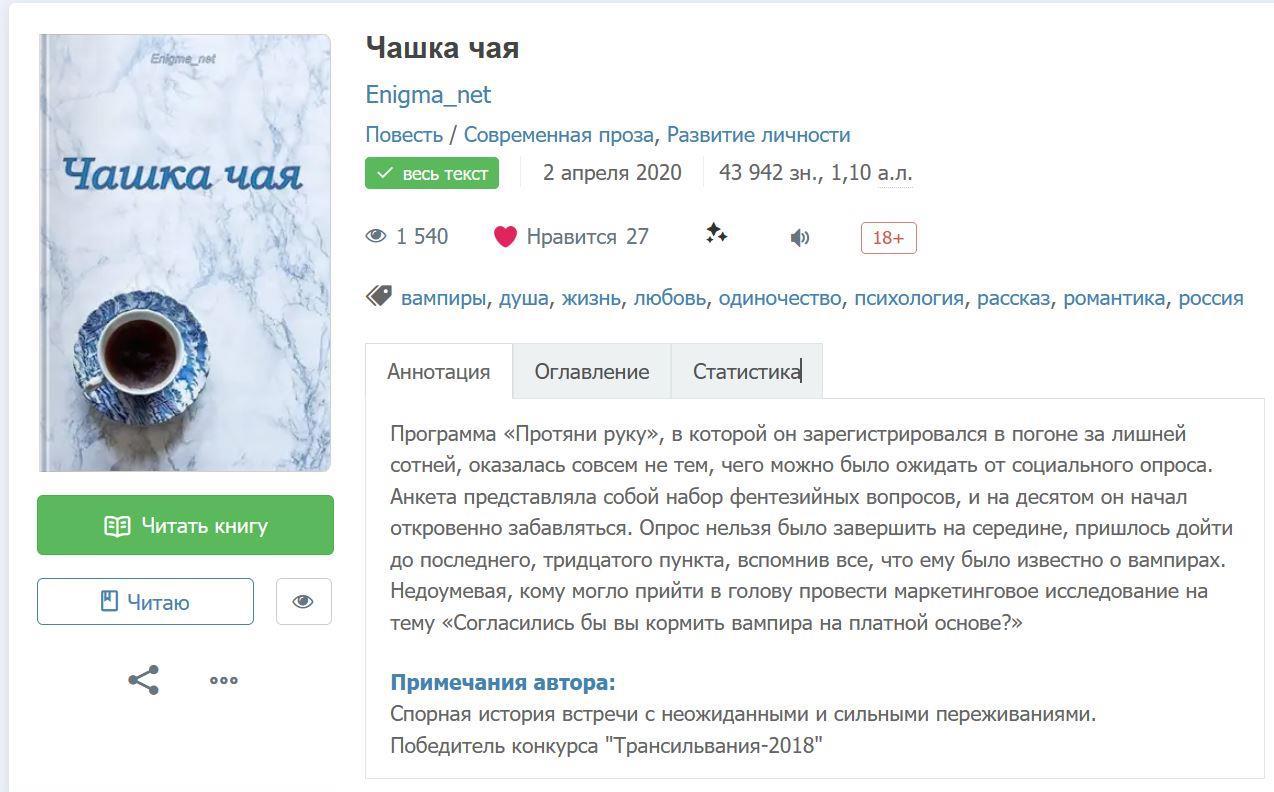 Опыт, горький опыт привёл меня к мнению, что книги в жанрах Современная проза/развитие личности вкупе с тегом "психология" -- это всегда кринж, лично для меня. Так ли это на этот раз? Не знаю. Вообще-то тут вроде как вампиры, значит есть фантдоп, значит это фантастика, значит всё не так плохо. С другой стороны...