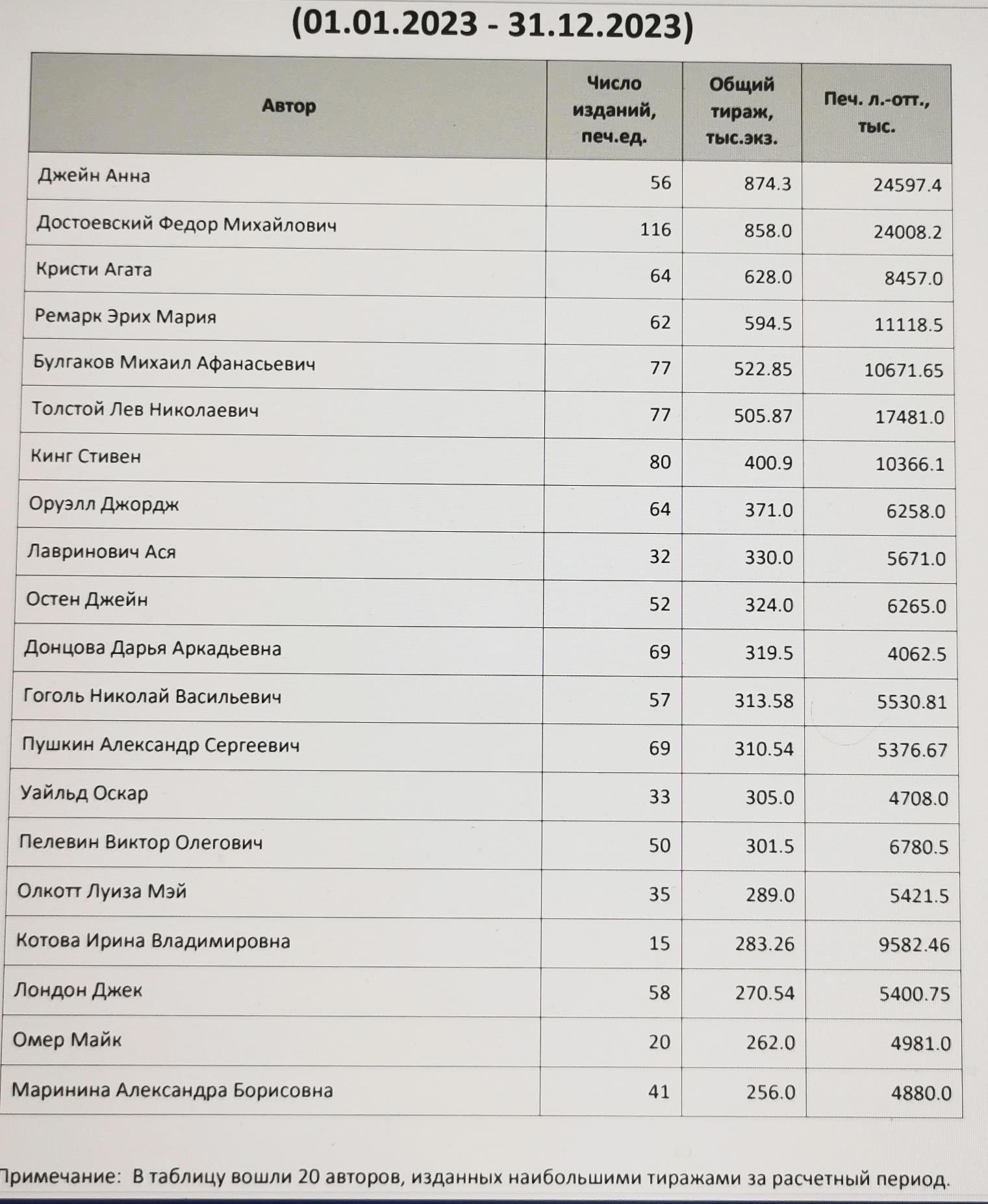 Еще удивительный факт из данной статистик. Ныне живущих авторов из 20 всего 8. В первой десятке только 3! А ведь казалось бы, Достоевского, Пушкина и Агату Кристи уже столько напечатали. Правда, им гонорары платить не надо, вот и штампуют.