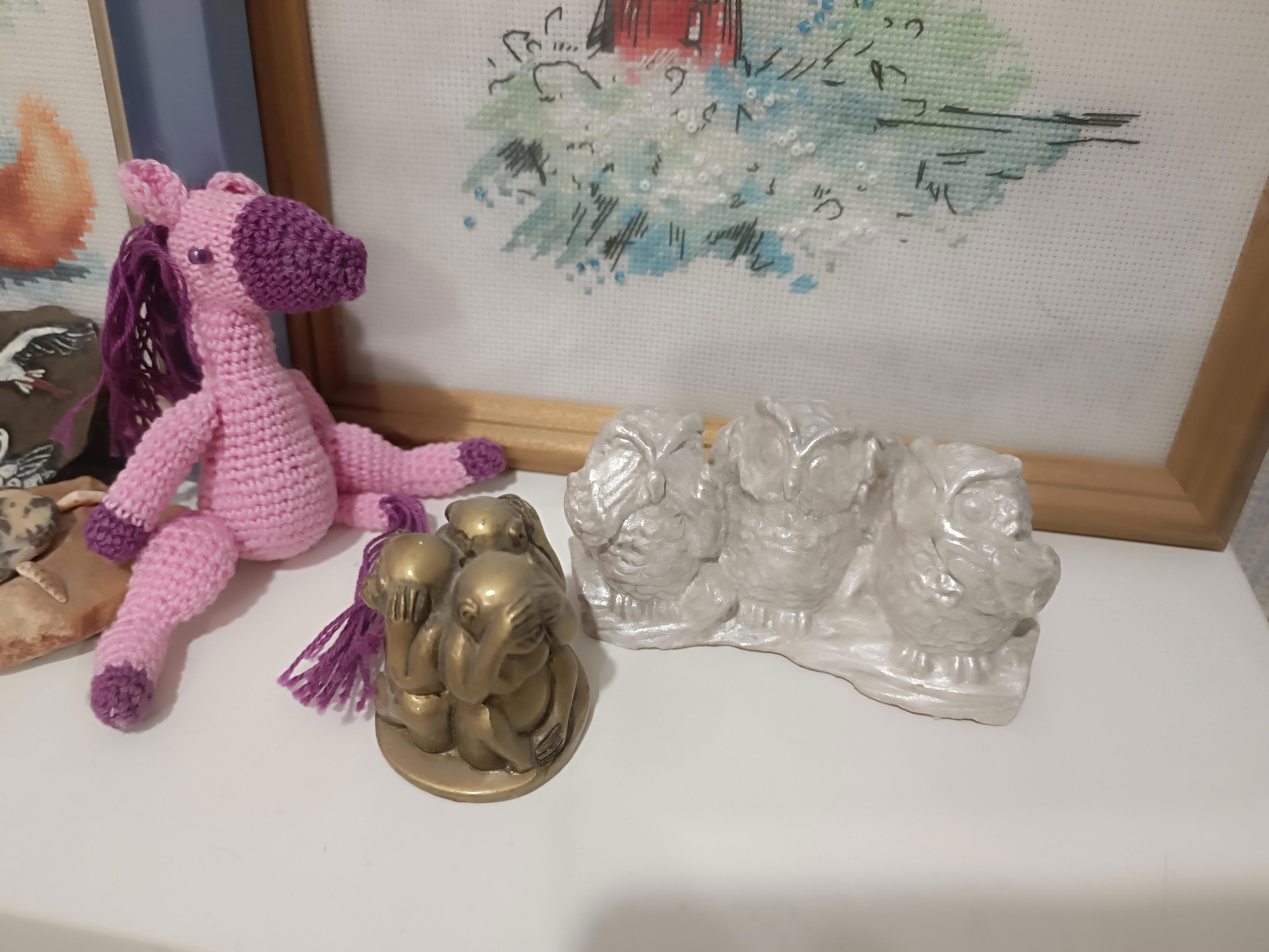 А ещё мне нравятся фигурки с мудрыми обезьянами. Это те, что олицетворяют идею «недеяния зла», которая звучит так «Если я не вижу зла, не слышу о зле, ничего не говорю о нём и не совершаю зла, то я защищён от него». Одна обезьяна прикрывает глаза, вторая уши, третья рот, а четвёртая низ живота.