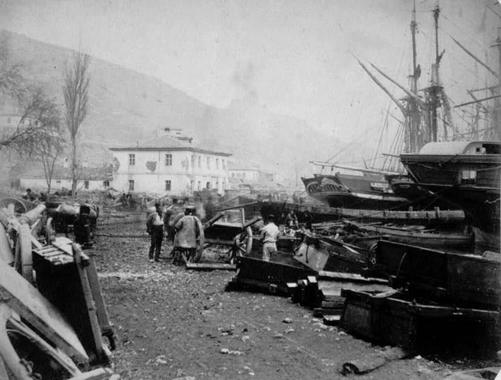 артиллерийская батарея, подобная той которой приходилось командовать подпоручику Л. Н. Толстому. Далее – вид на бухту, а вблизи от нее лишь руины зданий да перепаханная земля.