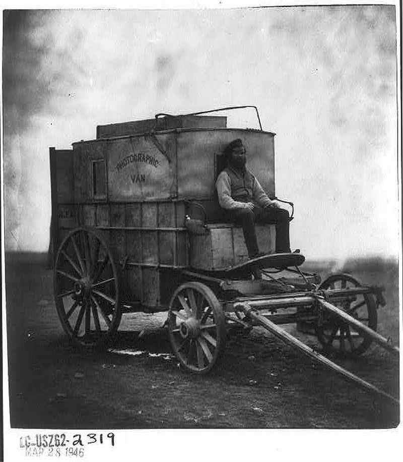 Аппаратура, химикалии, стекла были тяжелы и громоздки. Фентон остроумно решил проблему передвижения: сконструировал пароконный "Фотографический фургон", по крайней мере, так гласила надпись на его бортах. Повозка одновременно являлась и темной комнатой.
