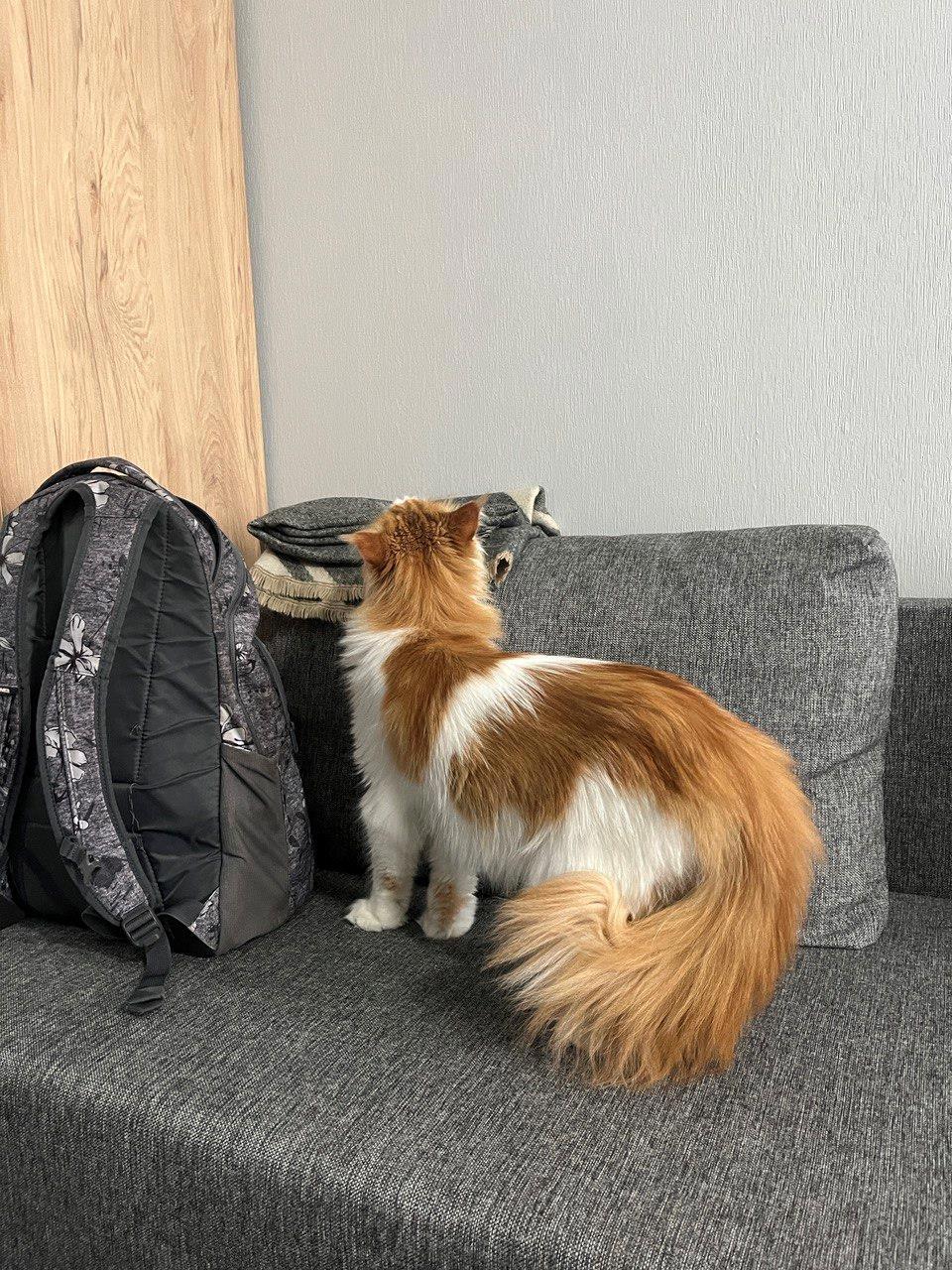 26 февраля 2021 года: Кнопка первый день дома. Посмотрите, как поджат хвост - ужас. Боится жутко, но играет с фантиком. Бывший молодой человек ушёл за лотком и кошачей едой, потому что дома ничего для кошки нет - мы не были уверены, что заберём её, когда поехали смотреть этого заморыша.
