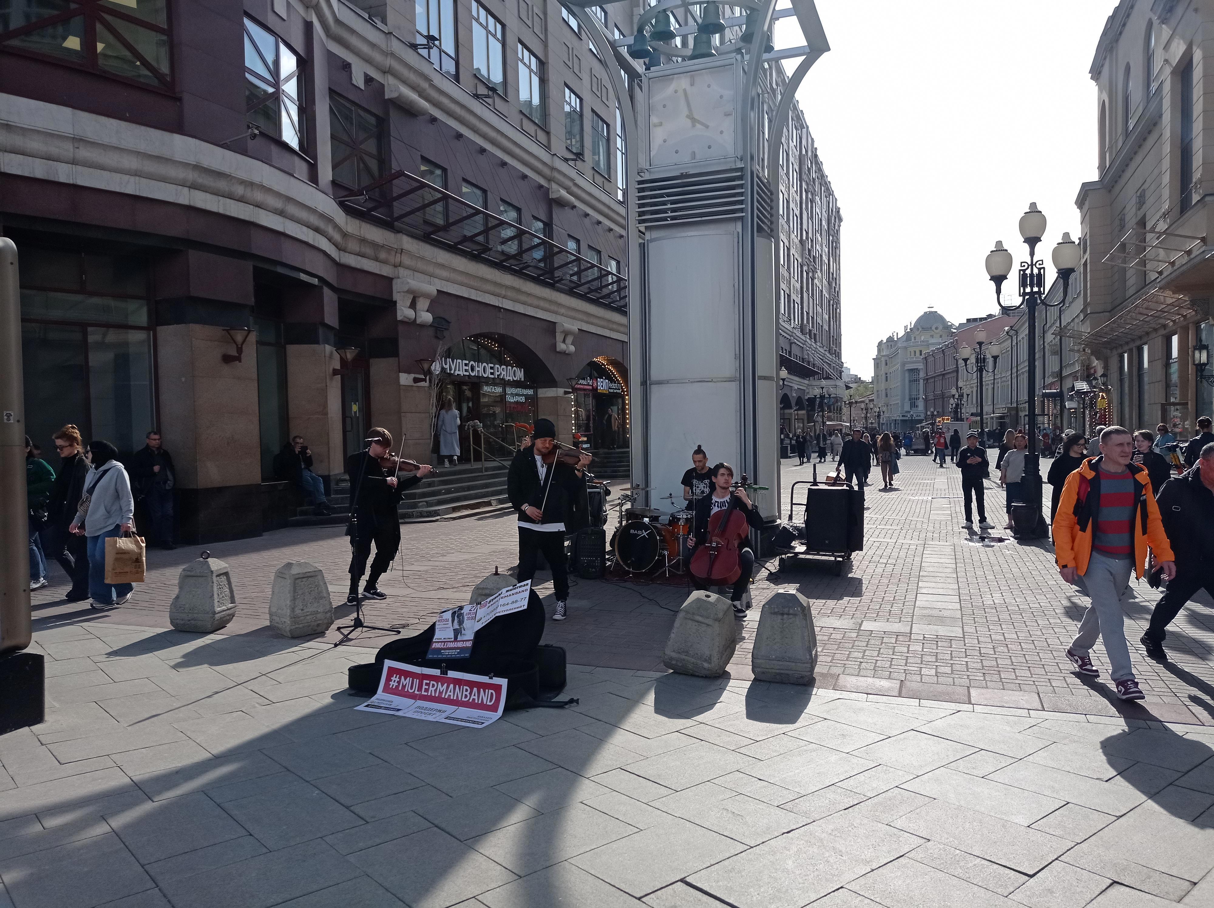В конце Арбата уличные музыканты исполняли различные хиты, к примеру «Куклу Колдуна» КиШа. Исполнение было потрясающим, все-таки на следующий день они давали где-то концерт, афиша об этом была наклеена над шапкой для пожертвований.