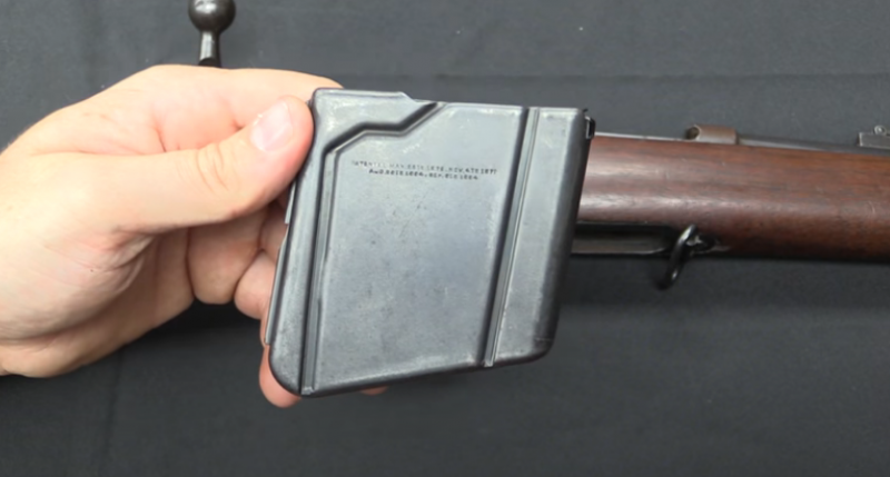 Спикер из ролика утверждает, что это вообще первый серийный образец с классическим коробчатым магазином центрального расположения. Лично я ни подтвердить, ни опровергнуть этот тезис пока не готов, но на вскидку мне действительно не попалось более ранних образцов такой конструкции. Да и надо отметить, что ещё вплоть до конца 1880-х - начала 1890-х годов изрядная часть винтовок имела трубчатые магазины - либо подствольные, либо в прикладе, и даже затворные однозарядки типа берданки ещё были вполне в ходу.