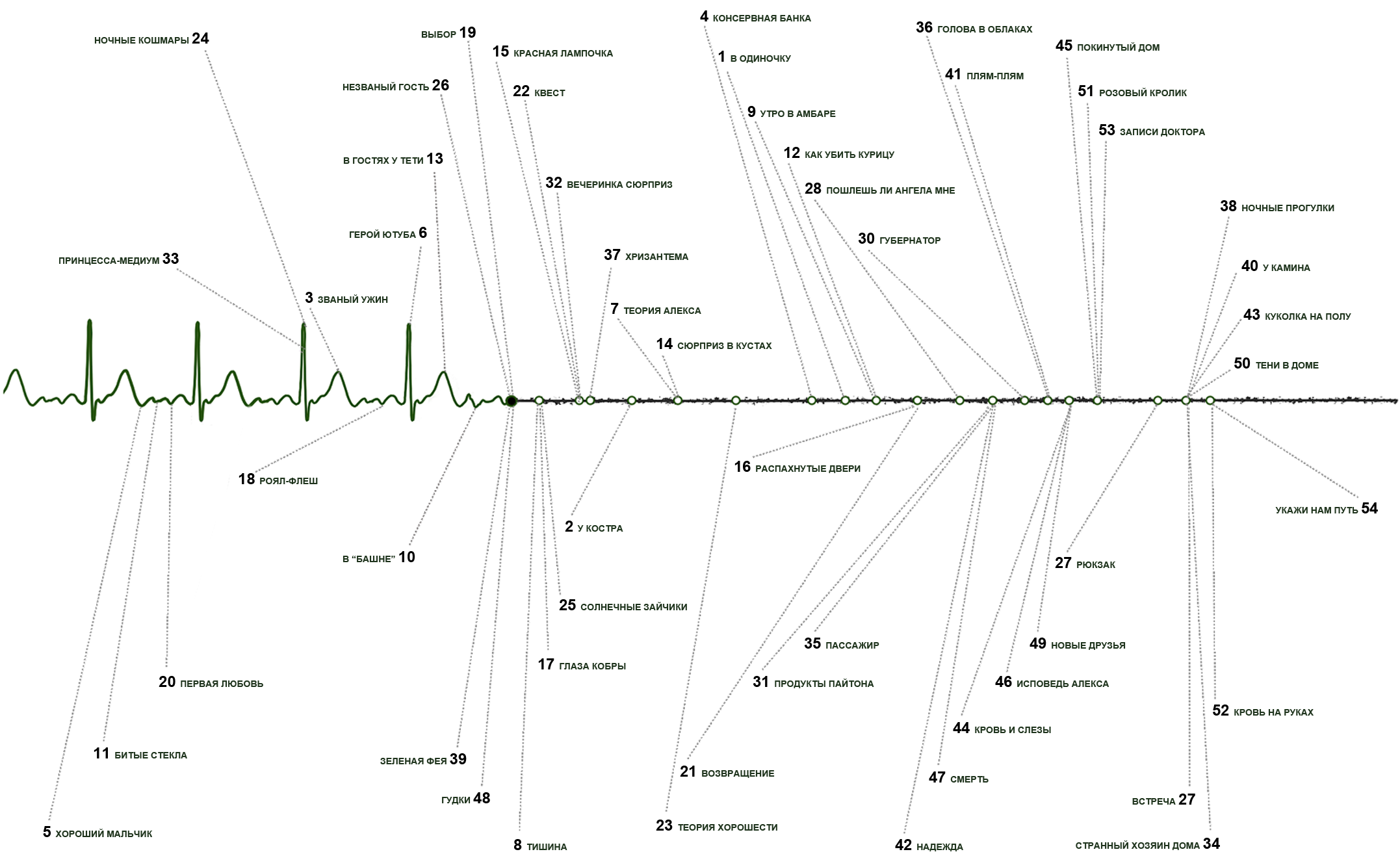 Автор: Талани КроссТеперь у содержания есть что-то вроде временной шкалы. Хотя, скорее, это даже не содержание, а карта событий. Она не отражает точных отрезков времени, но по ней можно проследить, какое из событий случилось раньше, а какое позже.