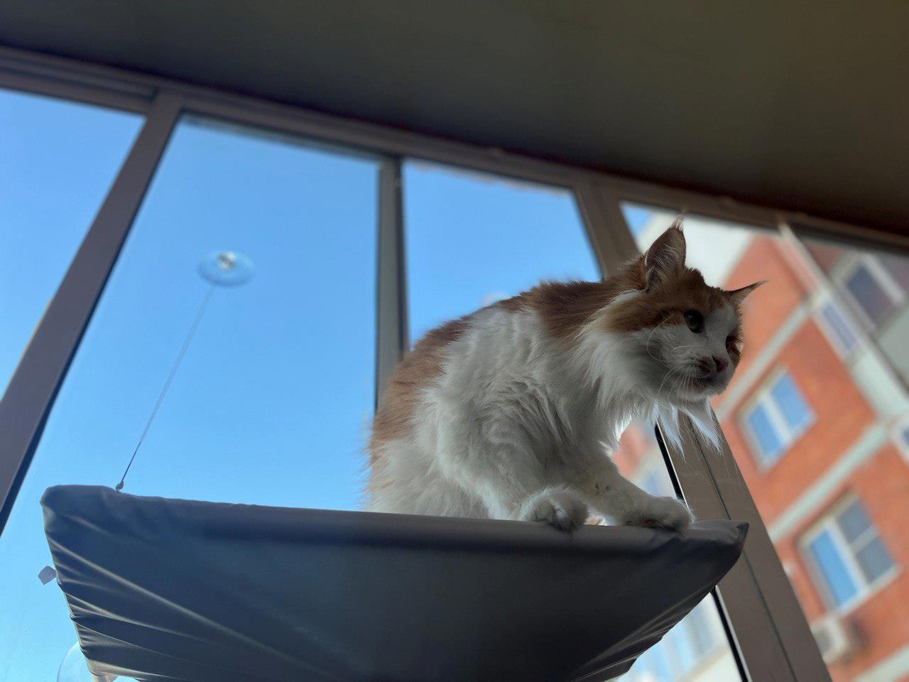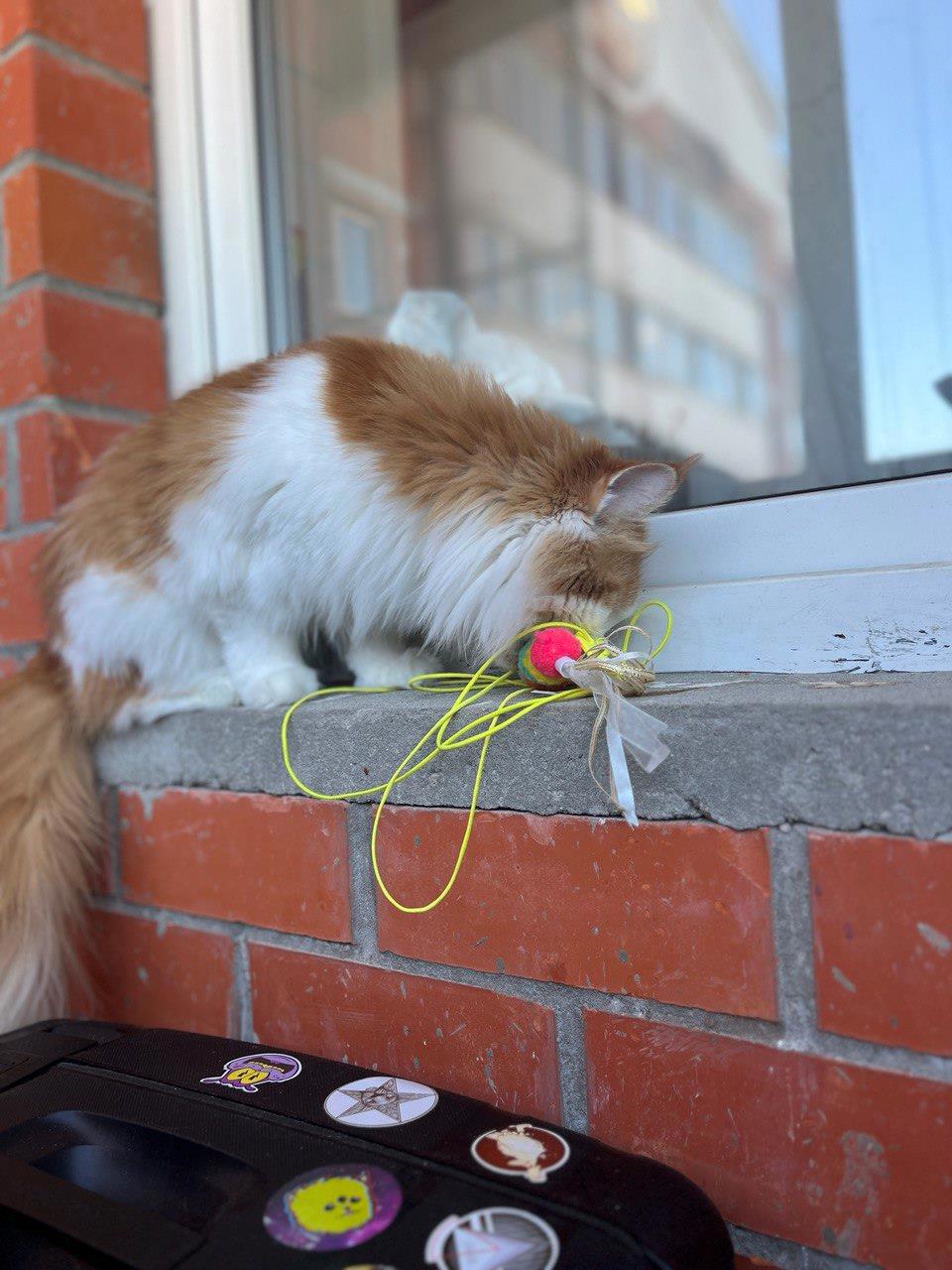 А на этой фотографии Кнопка заметила игрушку, которая раньше висела на окне, но я сняла, пока мыла окна на балконе.