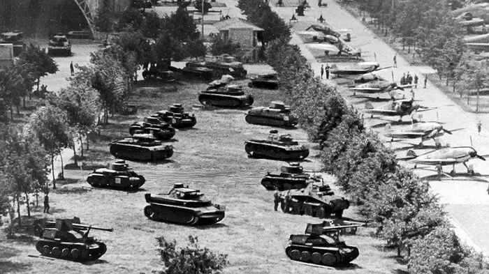 Танки и авиация. И напомню - французские танки там стоят равноправно - они дрались против нас, что бы там ни врали всякие ихсперды. Сомуа к примеру отлично виден. И чехи наравне.