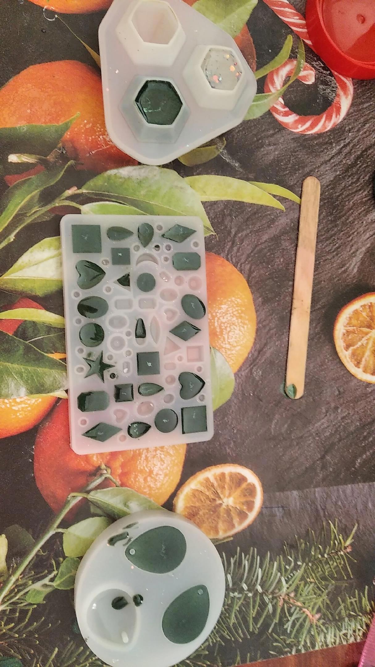 Для этого дела я экспериментировала с эпоксидной смолой - брала зеленый пигмент, блестки разных размеров в надежде симитировать огоньки магии внутри. Также я добавила светящийся в темноте порошок, так что украшение будет светиться ночью) По крайней мере должно