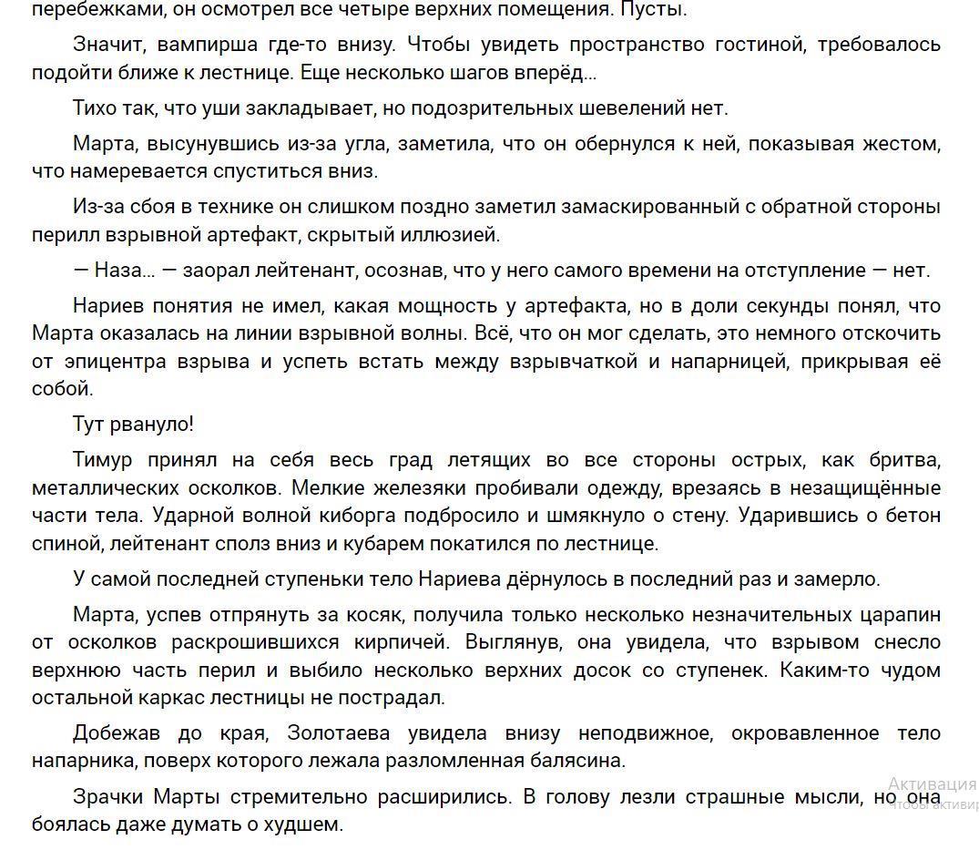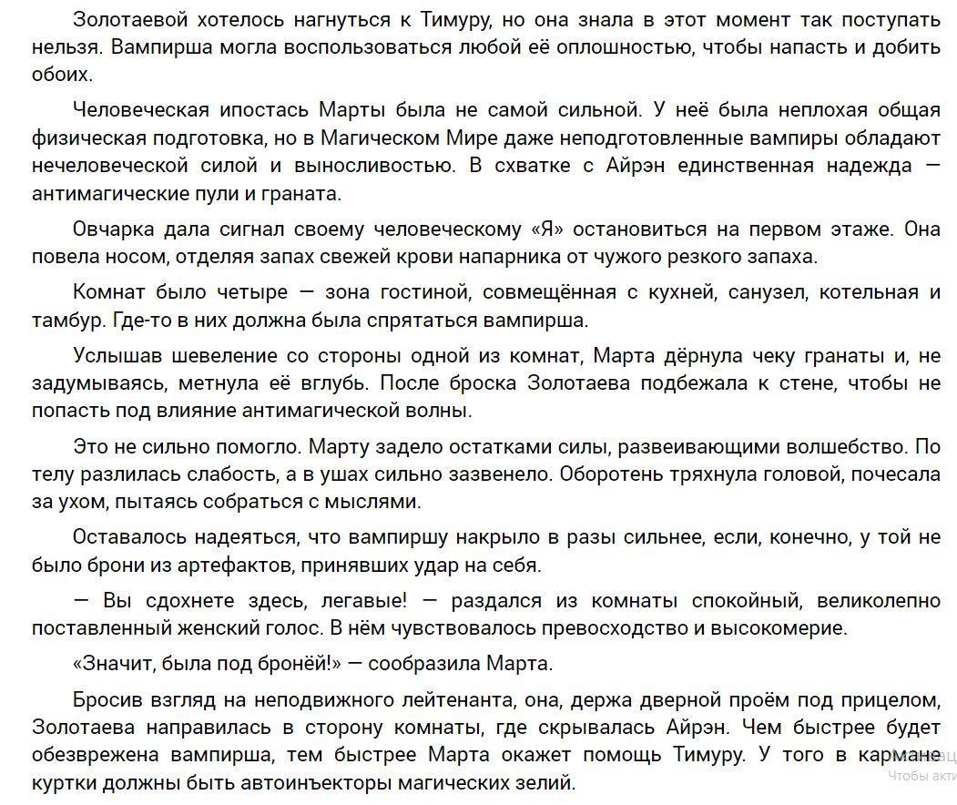Я обычно на все эти драки "делаю монтаж". Потому что хоть минимальный, но опыт боекви у меня есть, и я четко знаю, что думать и рассуждать во время схватки просто невозможно. Тело действует на рефлексах. С другой стороны, конечно, все эти схватки - это дополнительные килобайты текста, "битва в Пустоши" - целая глава, та самая классическая "финальная погоня", обязательная в любом полицейском детективе. Но хорошо писать драку... на АТ мне попались хорошие подробные драки разве что у Дмитрия Манасыпова https://author.today/u/id13972860
