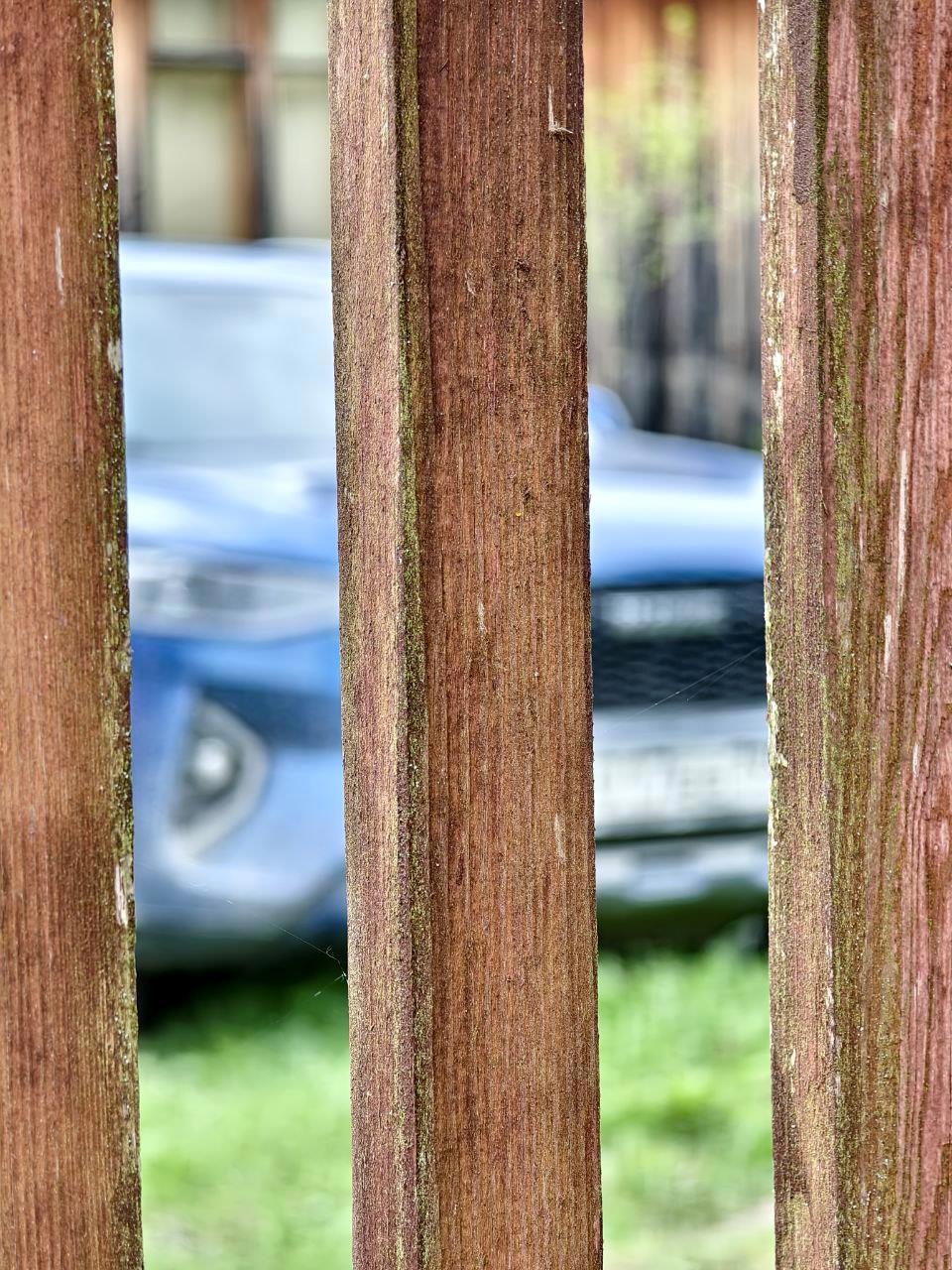 А потом подумал, что могу сделать похожий кадр, но немного с другим объектом и сделал это с автомобилем, что выделялся своей синевой, стоя за забором дачи. Везде зелень, а он один синий; подсматривает за мной своим глазом.