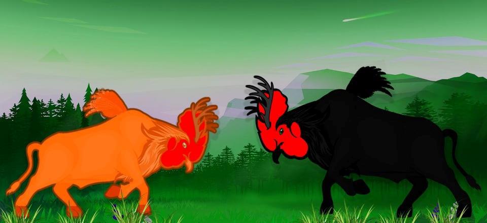 Здесь вот нарисовали описанную в книге битву двух куротуров: молодого рыжего и старого чёрного.