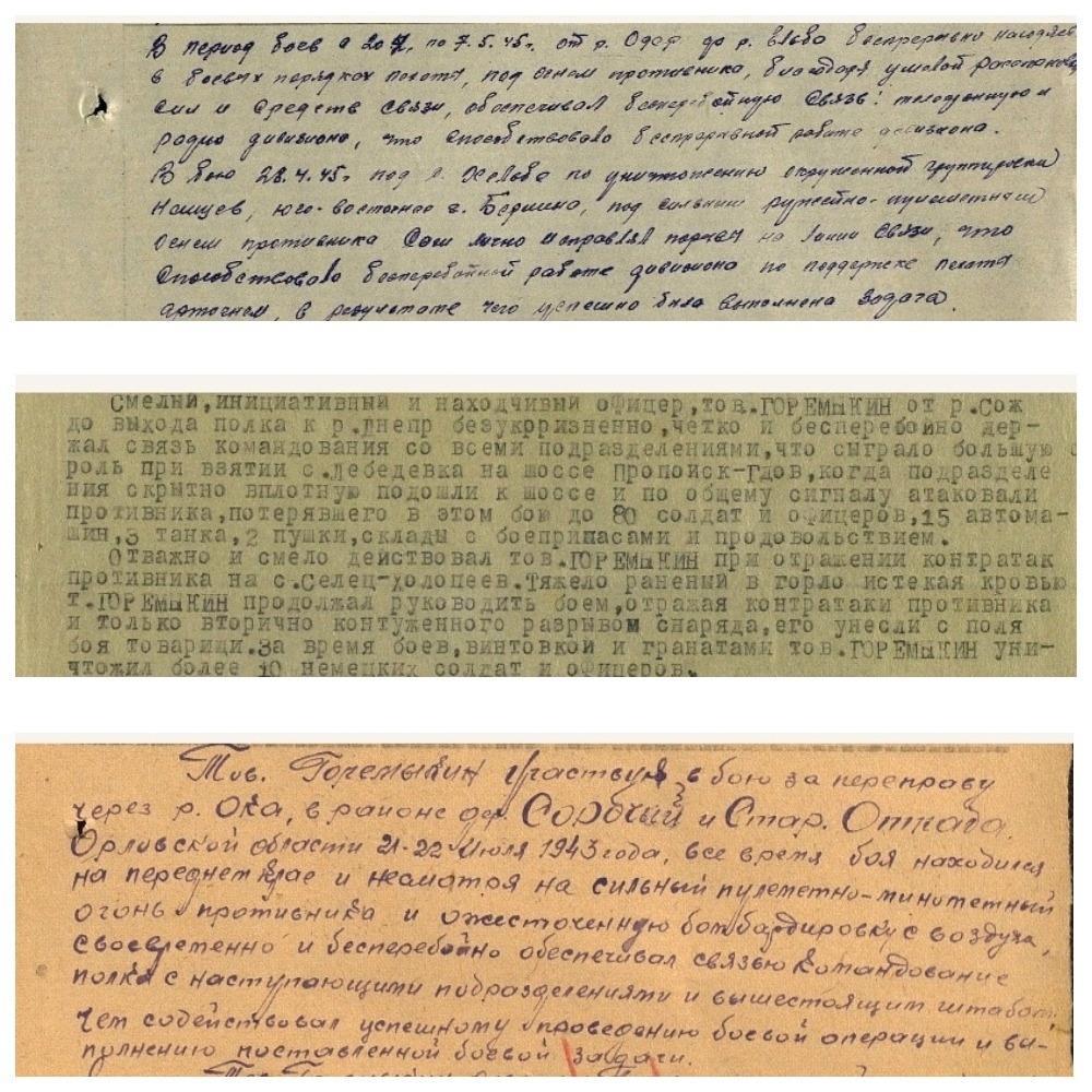 Тов.Горемыкин, участвуя в боях за переправу через р.Ока в районе дер.Сорочий и Стар.Отрада Орловской области 21-22 июля 1943 года, все время боя находился на переднем крае и несмотря на сильный пулеметно-минометный огонь противника и ожесточенную бомбардировку с воздуха своевременно и бесперебойно обеспечивал связь командования полка с наступающими подразделениями и вышестоящим штабом, чем содействовал успешному проведению боевой операции и выполнению поставленной боевой задачи.