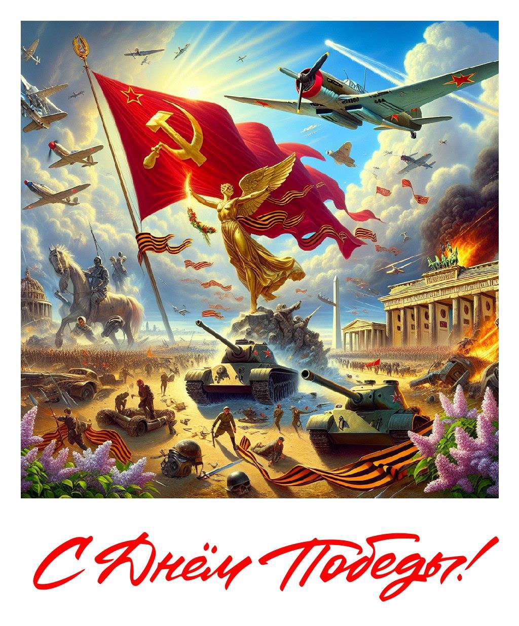 Но мы знаем, что наши "девочки-дизайнеры" чего только не вытворяли с плакатами ко Дню Победы, а потому просто давайте забудем этот ужас. Вот тут иная нейросеть, получилось простенько - но со вкусом, на мой взгляд.