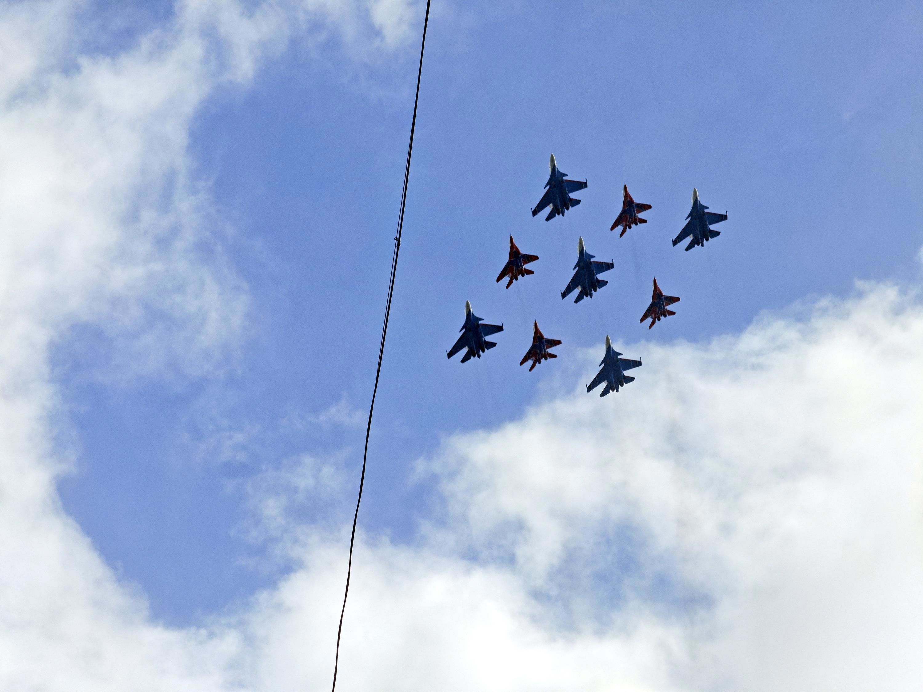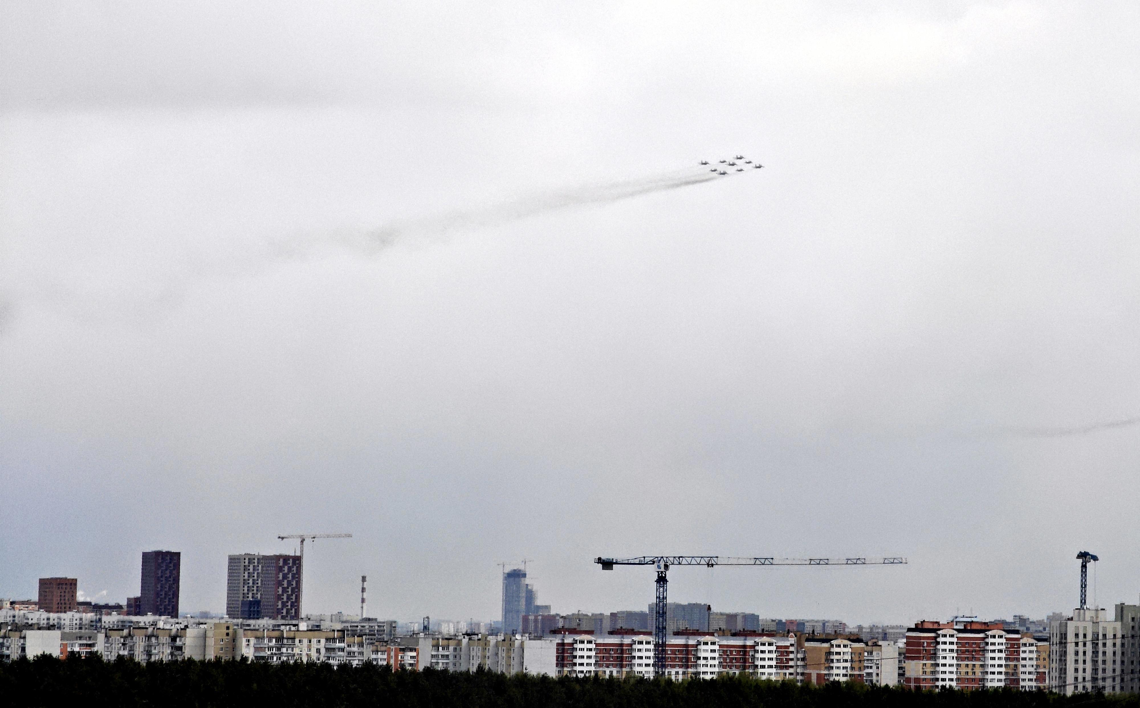 Смотрели с семьёй парад, и через несколько мгновений увидели в окне миги и сушки, пролетающие над Москвой. Успели сфотать. Делюсь!