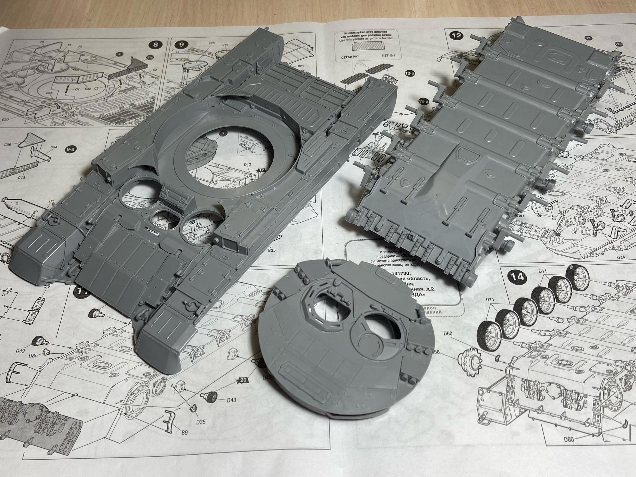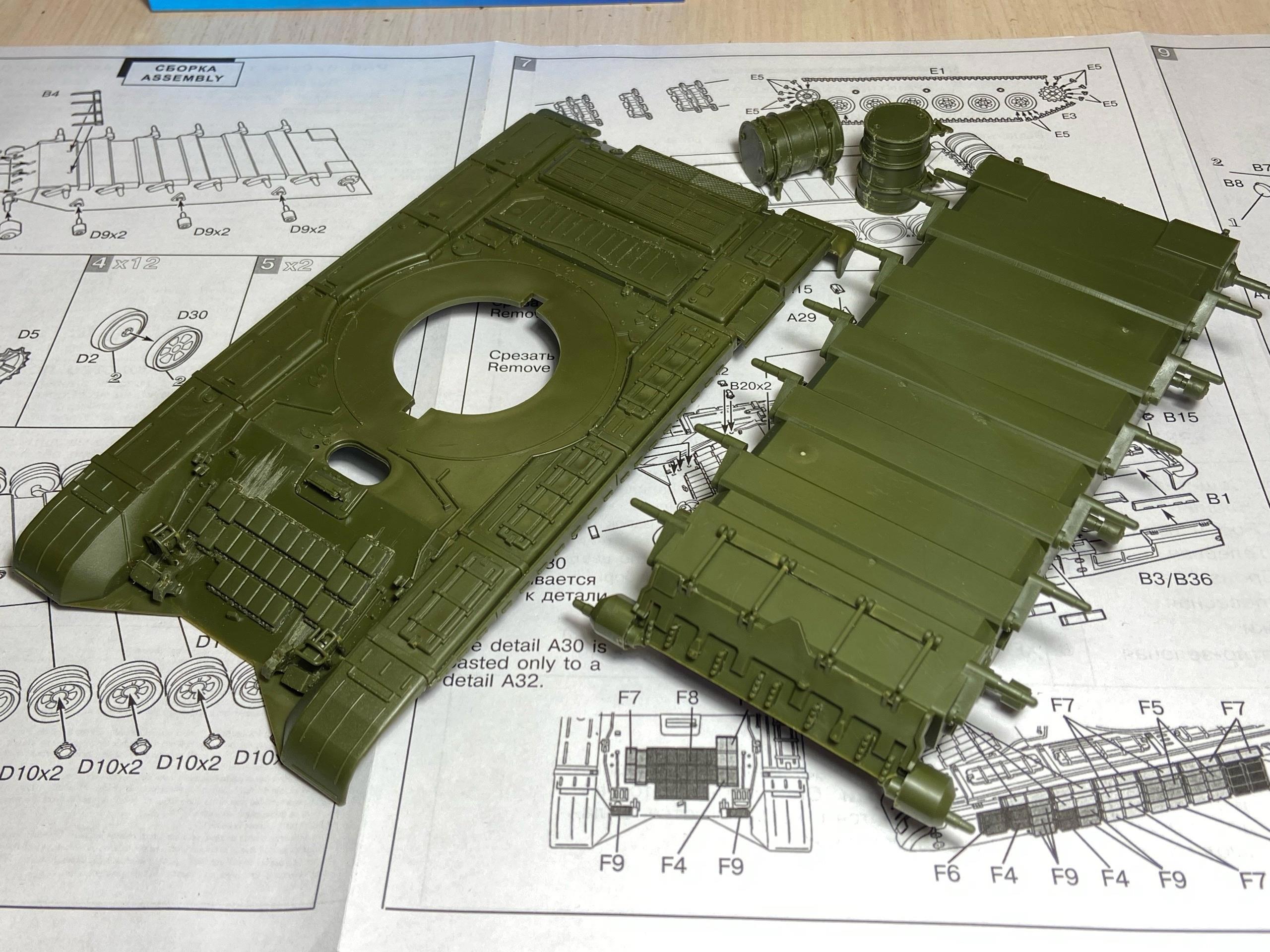 Позанимался Т-72Б. Отличный повод сравнить старую китайскую модель (зеленый) и новую чисто звездовскую (серый) примерно на одинаковой стадии сборки. Техника разная, но основа одна - Т-72: