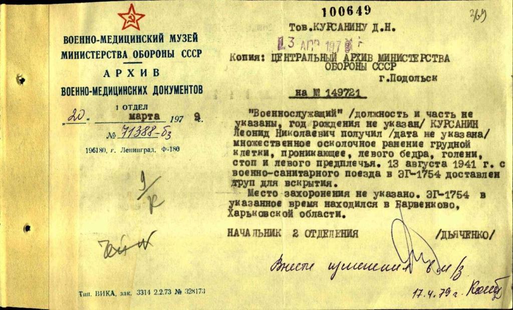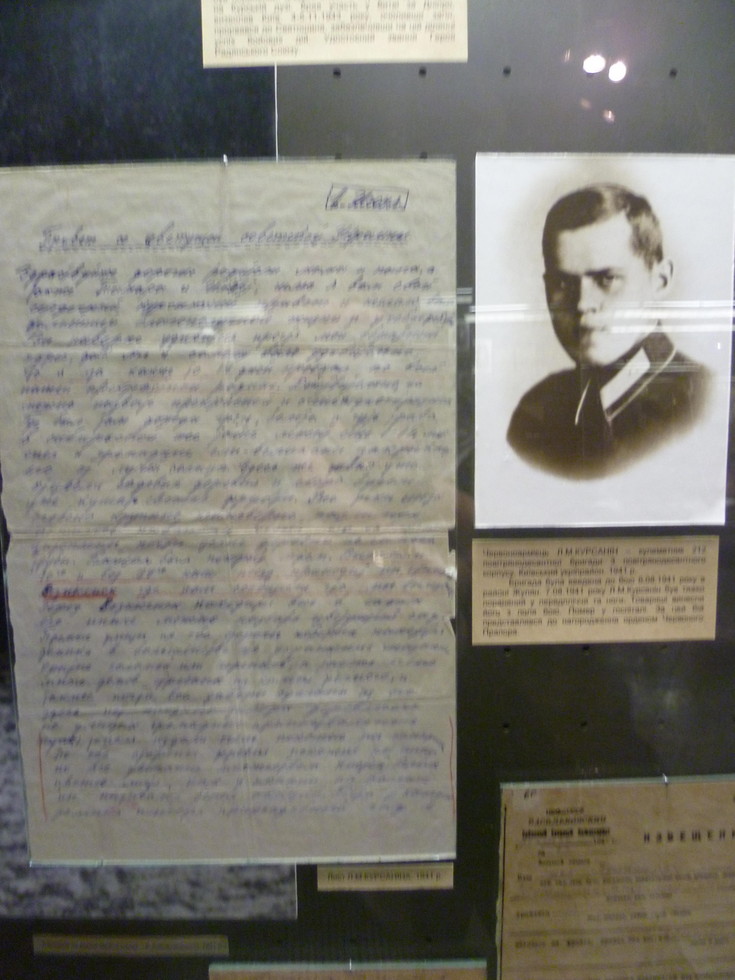 Младший брат Леонида - Дмитрий Курсанин передал письмо и фотографию в музей ВОВ в г. Киеве, так как Леонид Курсанин защищал Киев. А его фото в музее ВДВ я нашла недавно, пару лет назад - наша семья не знала, что он воевал на Халкин-Голе. Вот такая была секретность.