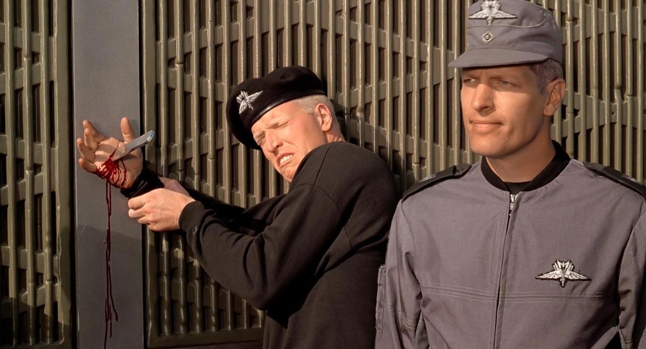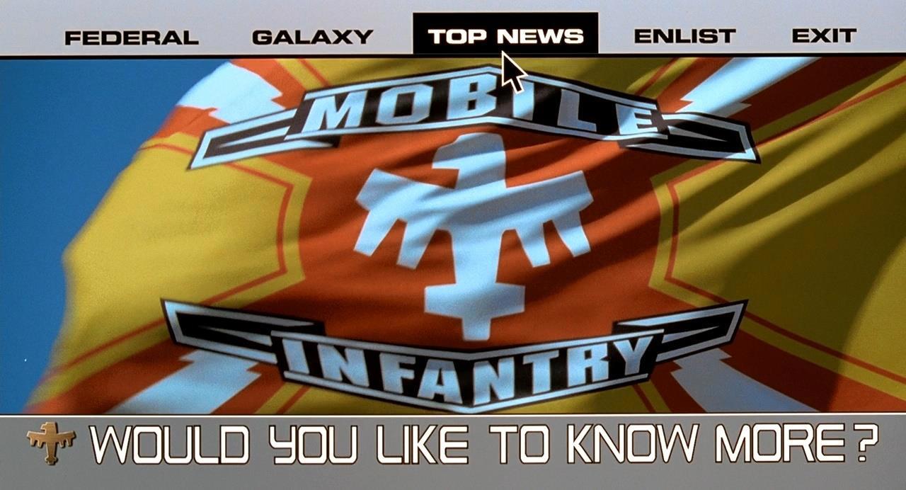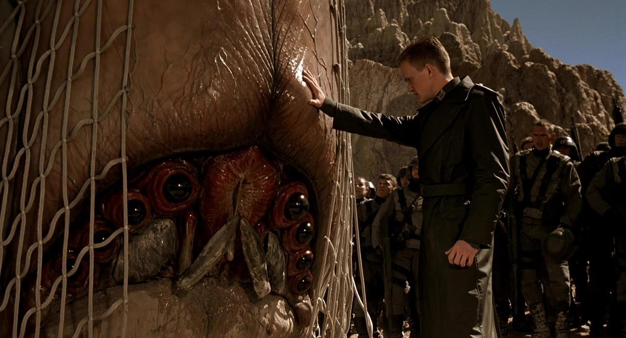 Тем более, Верховену вступило сделать антивоенную сатиру, чем он и занялся, приправив своё видение тоталитаризма динамикой, бодрыми пострелушками, любовным треугольником, так себе спецэффектами космоса и неплохими аналоговыми жукомонстрами. Ну и, заодно, не удержался, придав армии Федерации дизайн формы Третьего Рейха, включая особые мелочи гардероба а-ля Гехаймештаатполицай, т.е Гестапо.