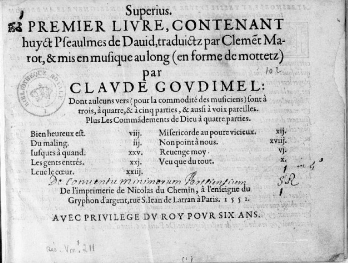 Зато точно известно, что в 1549 году Гудимель учился в Парижском университете. И примерно в это же время были опубликованы его первые песни, а в 1551-1554 годах -- первая книга псалмов.