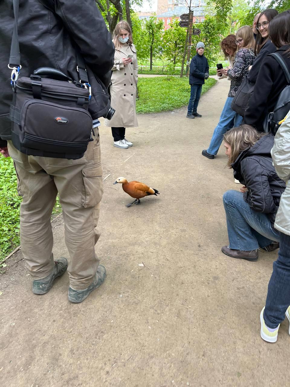 Утка выскочила к группе туристов в надежде поживиться чем-нибудь съестным.