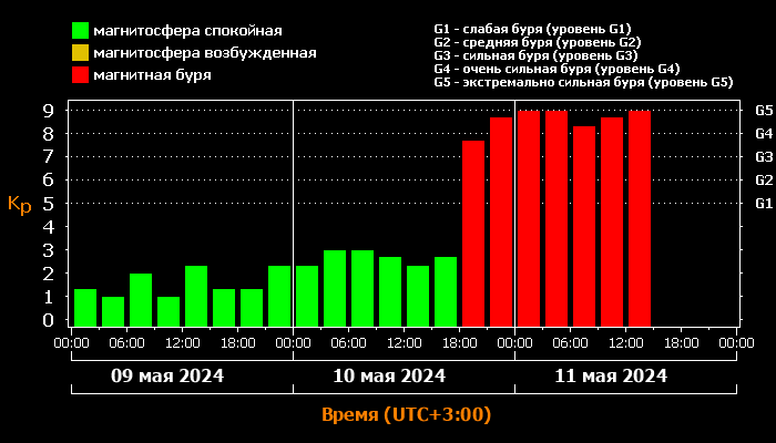 11 мая 2024 года специалисты лаборатории солнечной астрономии ИКИ (Институт космических исследований) и ИСЗФ (Институт солнечно-земной физики) РАН предупредили, что на Земле началась магнитная буря высшего уровня G5. К Земле пришли наиболее скоростные массы, выброшенные Солнцем. Магнитная буря проходит через пик. Колебания поля вернулись к экстремальным значениям 5 уровня (экстремально сильная буря). Скорость солнечного ветра варьируется в диапазоне от 800 до 1000 км/с. Территорию РФ накрывает ещё более мощная полоса полярных сияний. Возможно опускание овала до южных границ страны.