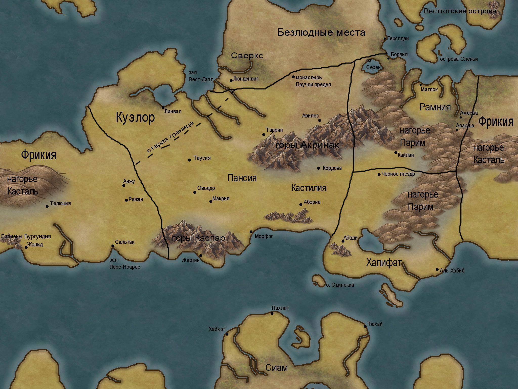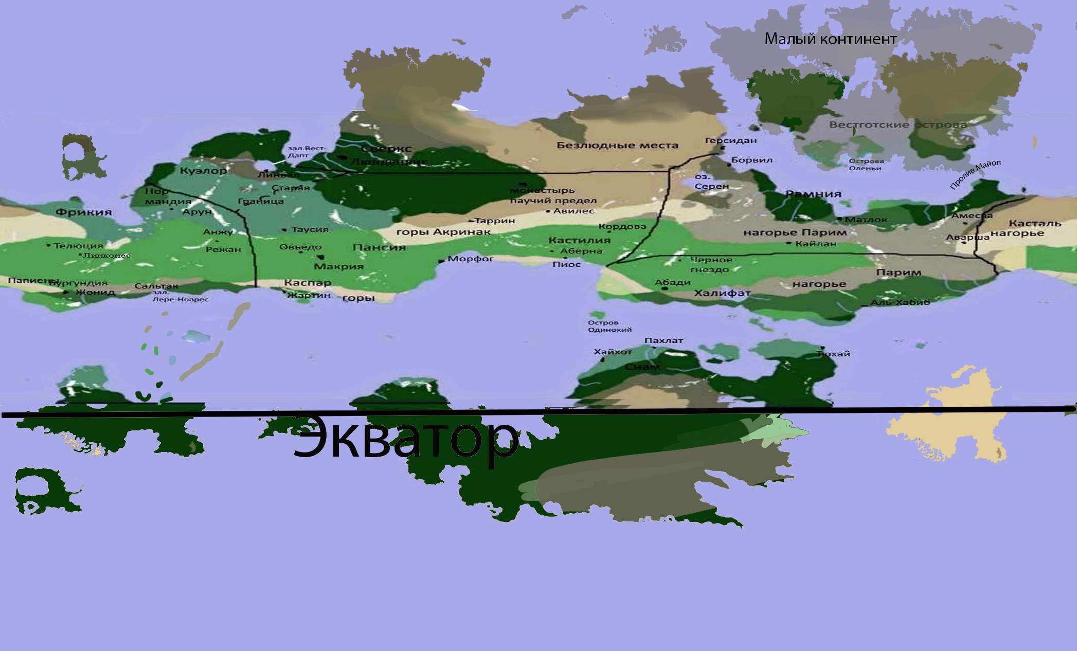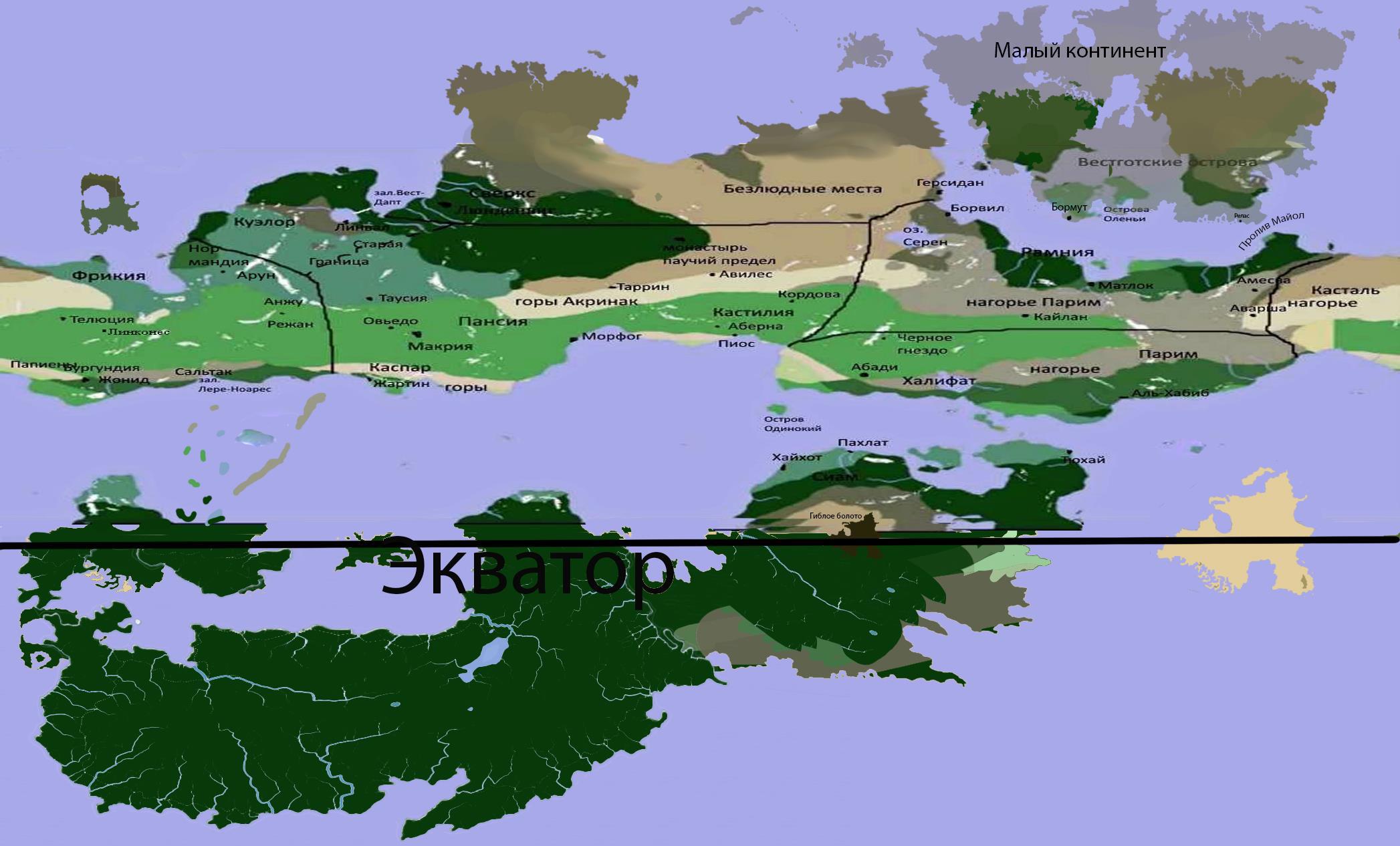 После этого я задумалась. Север Сверкса - это примерно широта Москвы и Смоленска. Вестгот - этот как в Великобритании. Севернее холодного Сверкса, но там, скорее всего, есть теплое течение, потому что там немного теплее, чем в Сверксе. Халифат и Пансия - это примерно средиземноморье или чуть южнее. Халифат вообще очень жаркая страна. Сиам - это джунгли и что-то вроде экватора. То есть получается, то этот тощий северный континент довольно большой. По моим представлениям где-то внизу проходит линия экватора. И я решила карту дополнить. Покажу все свои мучения.