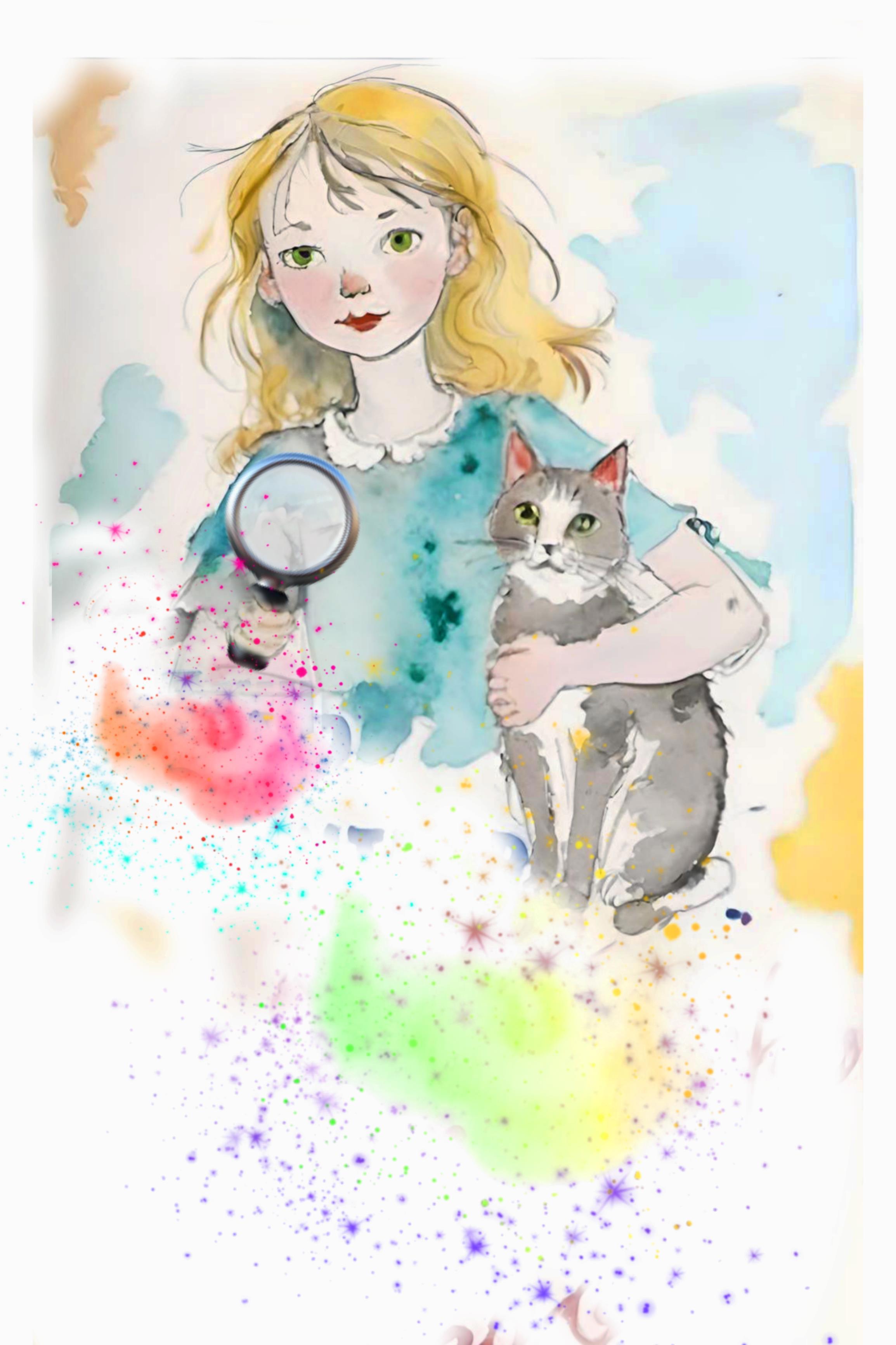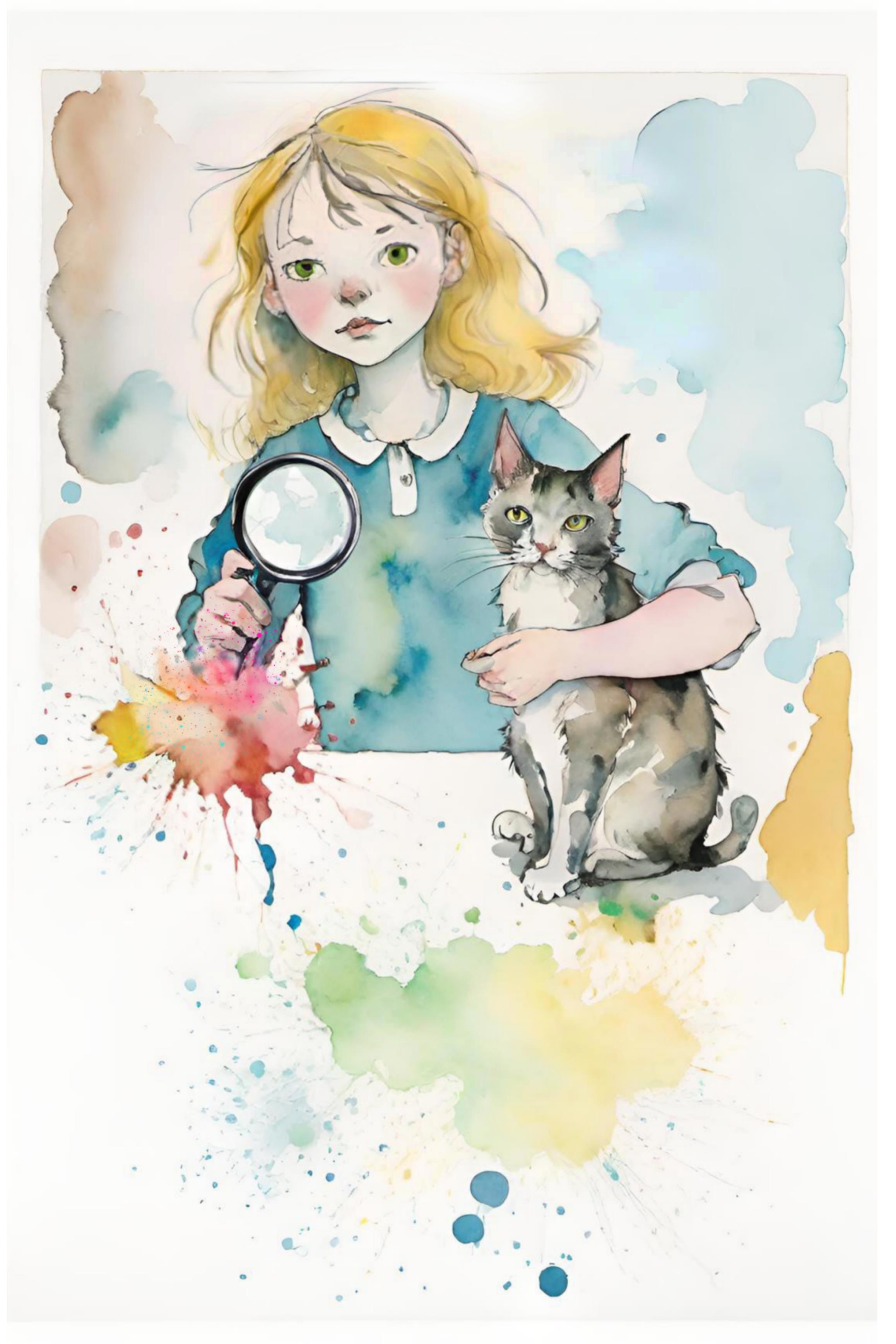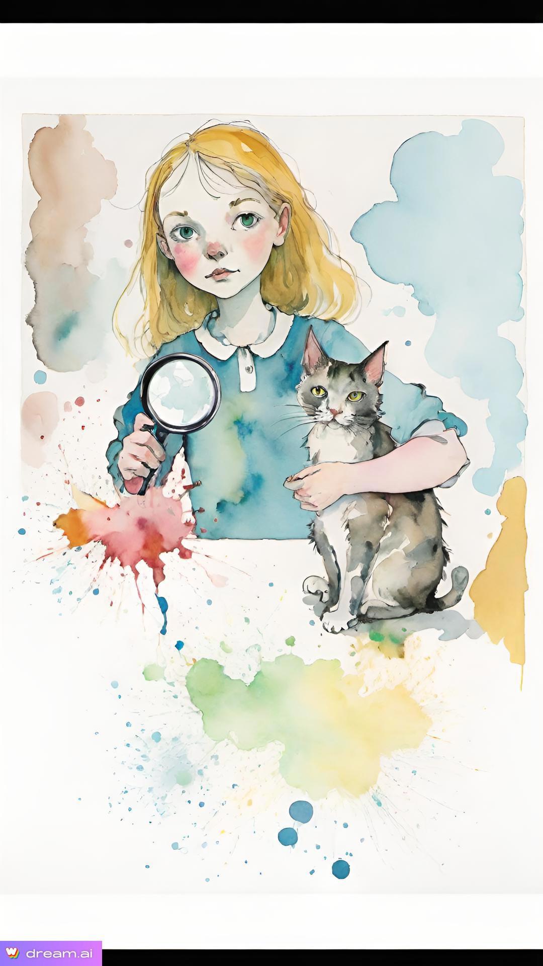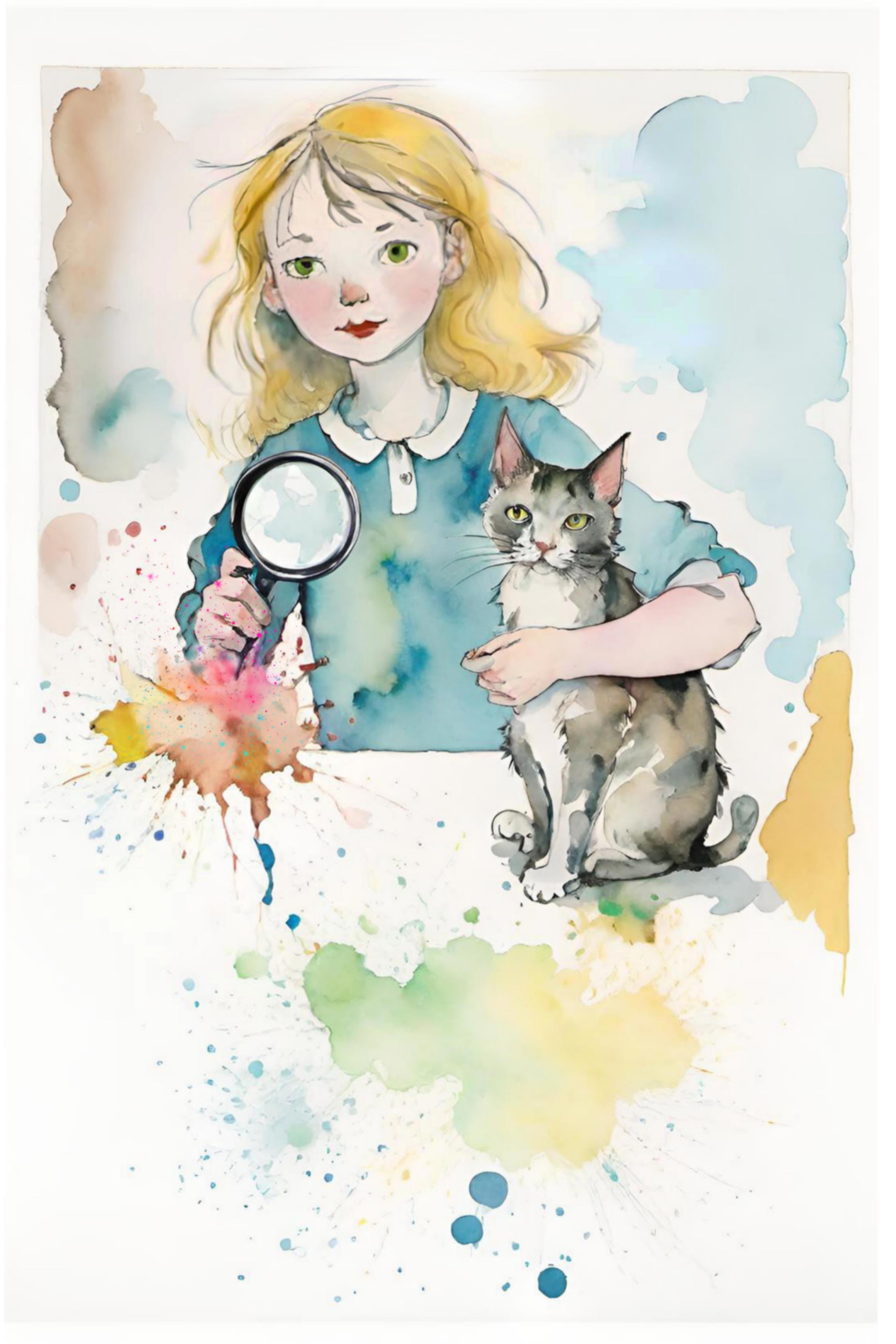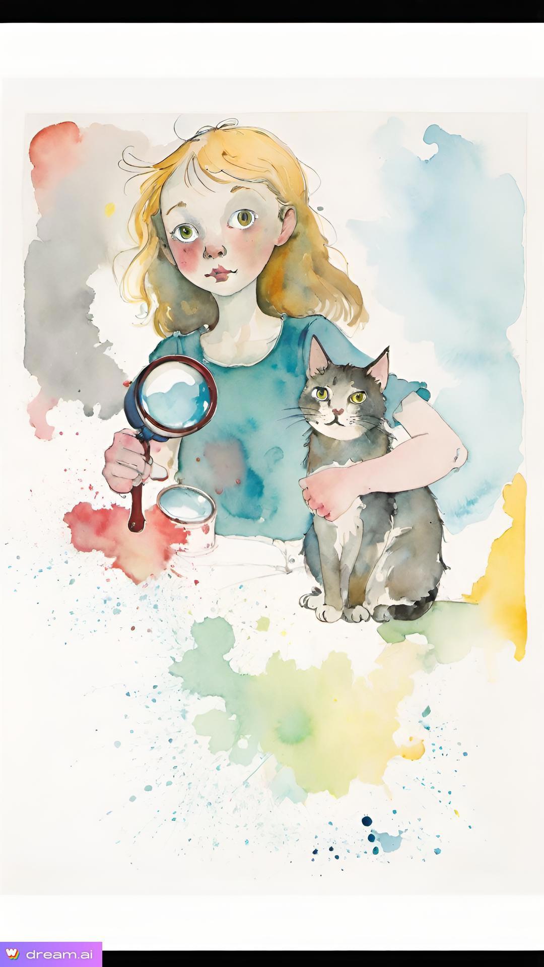"Girl with a cat and with a magnifying glass in her hand, girl, cat, aquarelle, art, orphism, abstract, color splash"