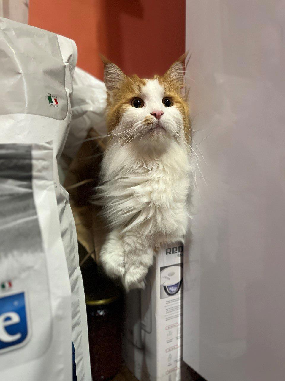 Автор: Анастасия ЖурбаМежду холодильником и стеной у нас валяется гора пакетов и несколько коробок. Почему-то Кнопка считает это невероятным местом для раскопок. Она может провести 15-20 минут копая пустые пакеты в поисках клада. Когда пакетная экспедиция подходит к концу, кошка укладывается на коробку и озирает кухонные владения из-за угла.