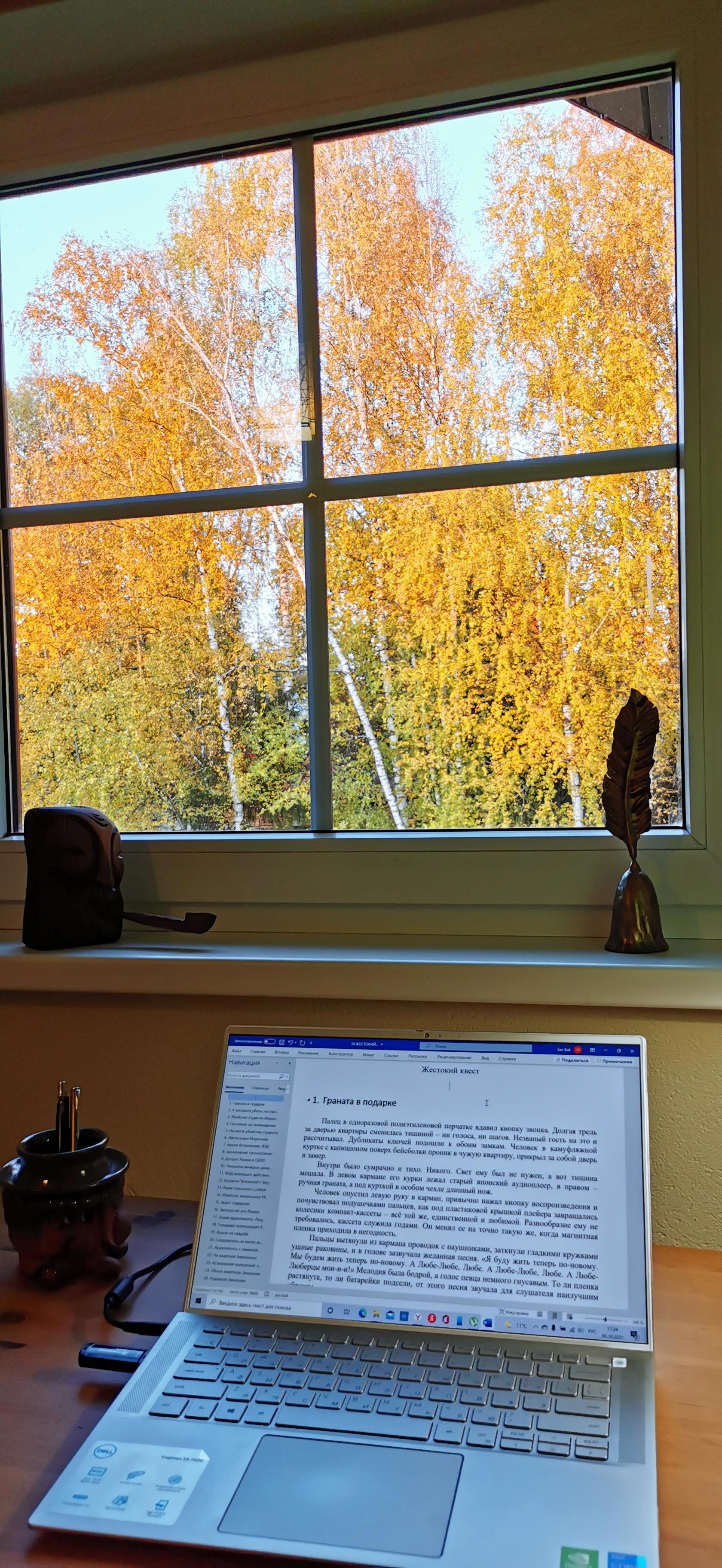 Отличный пример для подражания! Я тоже люблю уединяться «в имении». Вот вид с рабочего места на даче осенью.