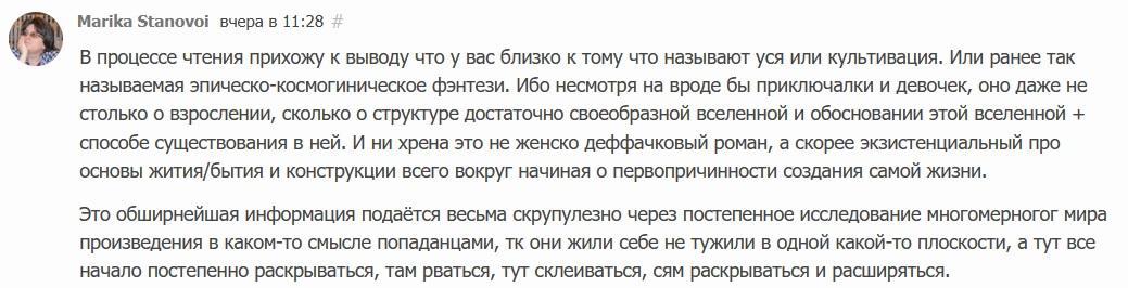 Хочется сказать огромное спасибо Марике за интерес к книге, и за терпение, с которым она выносила начало сюжета, где ещё ничего не было понятно, и за разрешение её цитировать! Но главное за то, что суть, суть она уловила, поняла и даже умудрилась сформулировать.