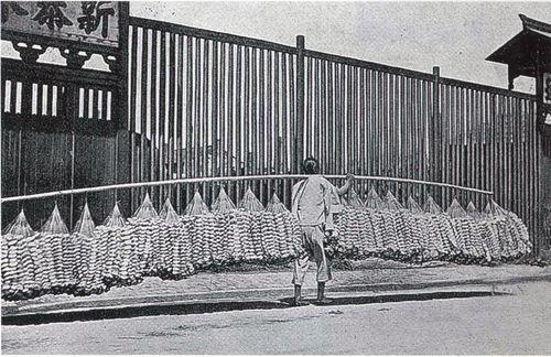 "Мы наблюдали длинные процессии людей с тачками, движущихся от каналов по улицам с большими грузами [урожая] в связках длиной в фут и диаметром в пять дюймов. Они прибыли из страны на лодках, каждая из которых перевозила тонны сочных листьев и стеблей. Мы насчитали до пятидесяти человек с тачками, быстро проезжавших мимо определенного пункта на улице, каждый из которых перевозил от 300 до 500 фунтов [урожая] и двигался так быстро, что за ними было нелегко угнаться, как мы узнали, следуя за одним из поездов в течение двадцати минут до места назначения. За это время ни один человек в поезде не остановился и не замедлил шаг. Этот же тип транспортного средства также является одним из распространенных средств перевозки людей, особенно китаянок, и можно увидеть, как четверо, шесть и даже восемь человек едут вместе, приводимые в движение одним человеком на тачке ".