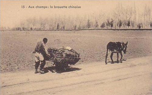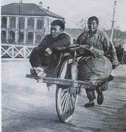 "Помимо перевозки грузов с помощью этих тачек, китайцы используют их также для перевозки пассажиров. Я видел целых шесть человек на них, по трое сидели с каждой стороны, свесив ноги вниз. Если перевозится только один человек, водитель умело балансирует на тачке, наклонив колесо под значительным углом от вертикали. Если крестьянин хочет отвезти свинью на рынок, он избавляет себя от необходимости направлять непокорное животное, привязывая его к тачке и везя на рынок."