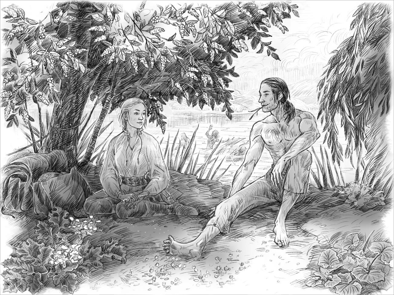 6. Путешествие в караване. Привал на бережку. Леона, Кирьян и плещущаяся в реке охрана: