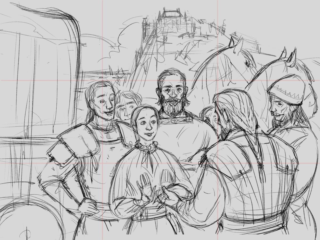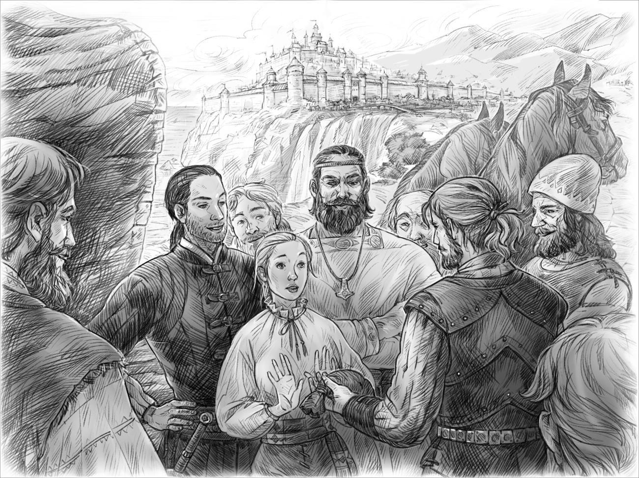 8. Конец путешествия. Леона, охрана каравана, купцы, телега и столица вдалеке: