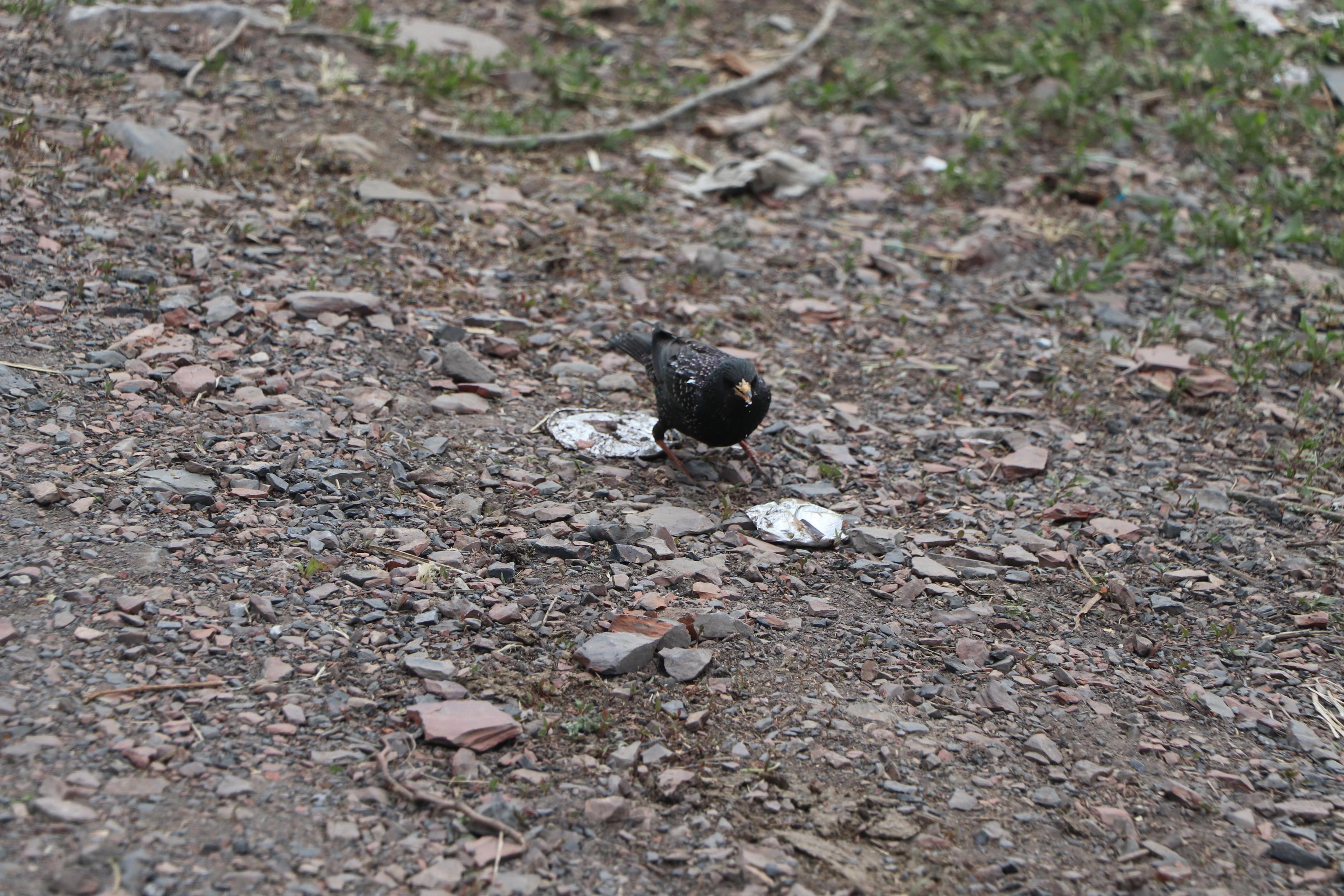 Раньше я не замечал, что скворцы такие же отважные, как и трясогузки. На прошлой неделе видел еще одного, тоже в дорожной пыли что-то выискивал.