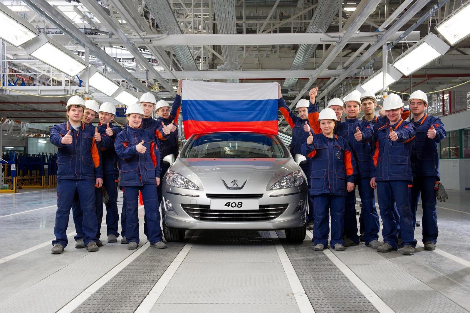 Работники кузовного цеха Пежо. Серёжа стоит справа и держит флаг России.