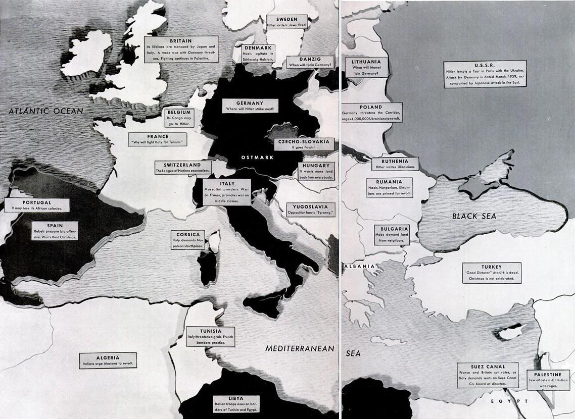 Черная тень в центре карты, несомненно, станет источником большинства неприятностей 1939 года. Вот фашистские державы — Германия и Италия, — которые говорят своим народам, что они самые храбрые, чистые, способные, счастливые, здоровые и красивые народы на земле. Хвастливые диктаторы этих двух стран, чтобы сохранить темп и действия, которые удерживают их у власти, дают колоссальные обещания своему народу — обещания, ради выполнения которых им рано или поздно придется вступить в войну.