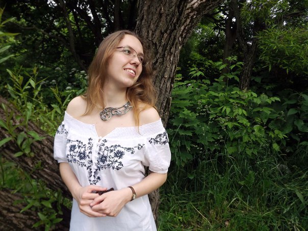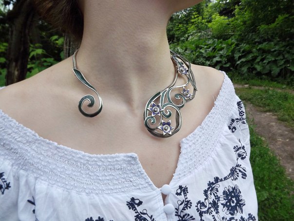 Колье выполнено в форме торвекса - это обратная шейная гривна. Отличительной особенностью этого украшения является незамкнутость и жёсткая конструкция. Материалы - мельхиор (сплав меди и никеля), нейзильбер (сплав меди, никеля и цинка), фианиты (искусственные камни под бриллианты, имеющие сильный блеск) и холодная эмаль (твердеющая под ультрафиолетовыми лучами). Разумеется, вся работа сделана вручную самолично.