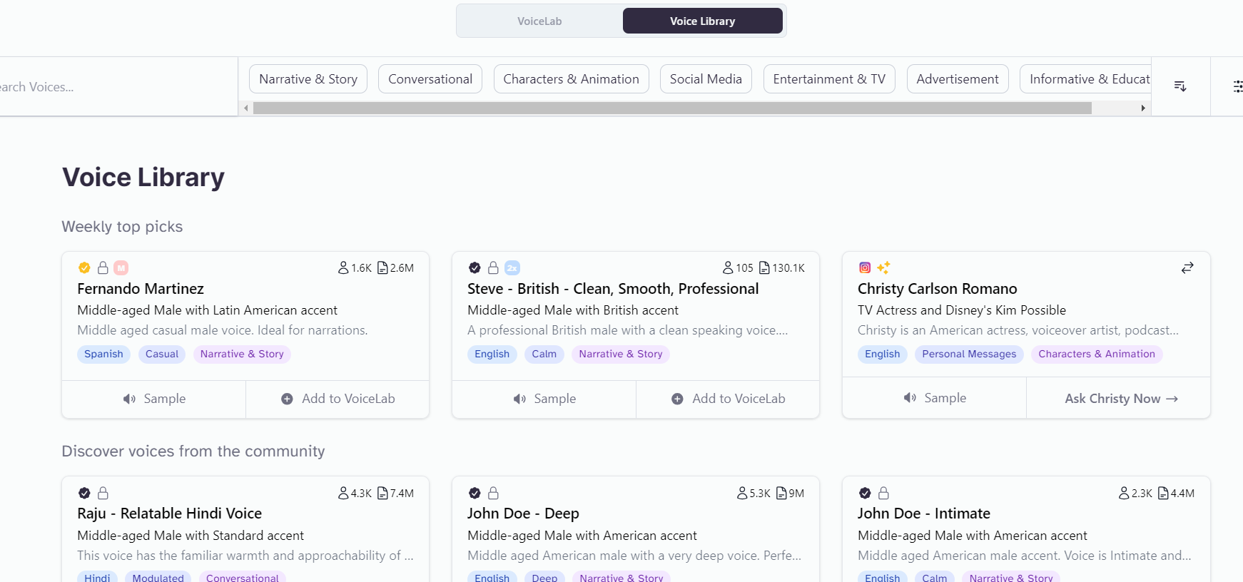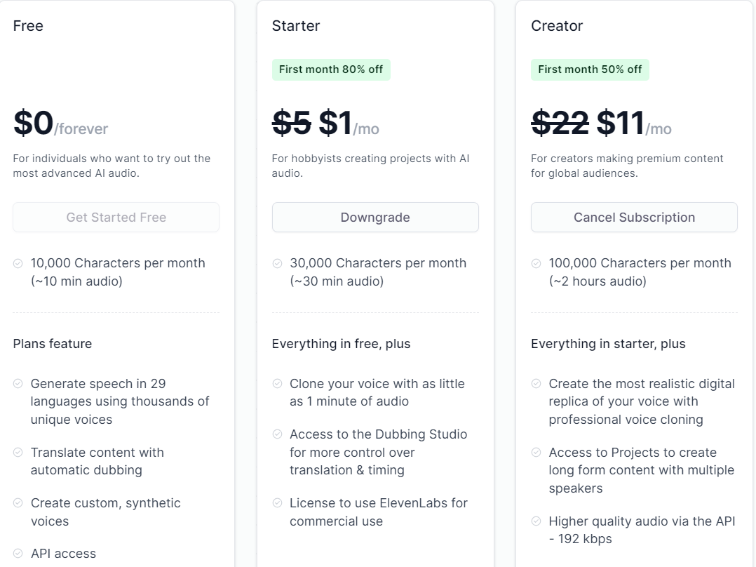 Так что с озвучкой пришлось попрощаться аж до 2024 года, когда я обнаружила, что на рынке существуют различные онлайн-инструменты, которые позволяют авторам озвучивать свои книги с помощью ИИ. Например, такие платформы, как Google Text-to-Speech, Amazon Polly, и Microsoft Azure Text-to-Speech, предлагают бесплатные тарифные планы для ограниченного использования. Из всех этих инструментов я решила поиграться с ElevenLabs, поскольку они предлагали аж целую сотню реалистичных голосов, а цены варьировались от 1 до 11$ за 100 000 знаков.