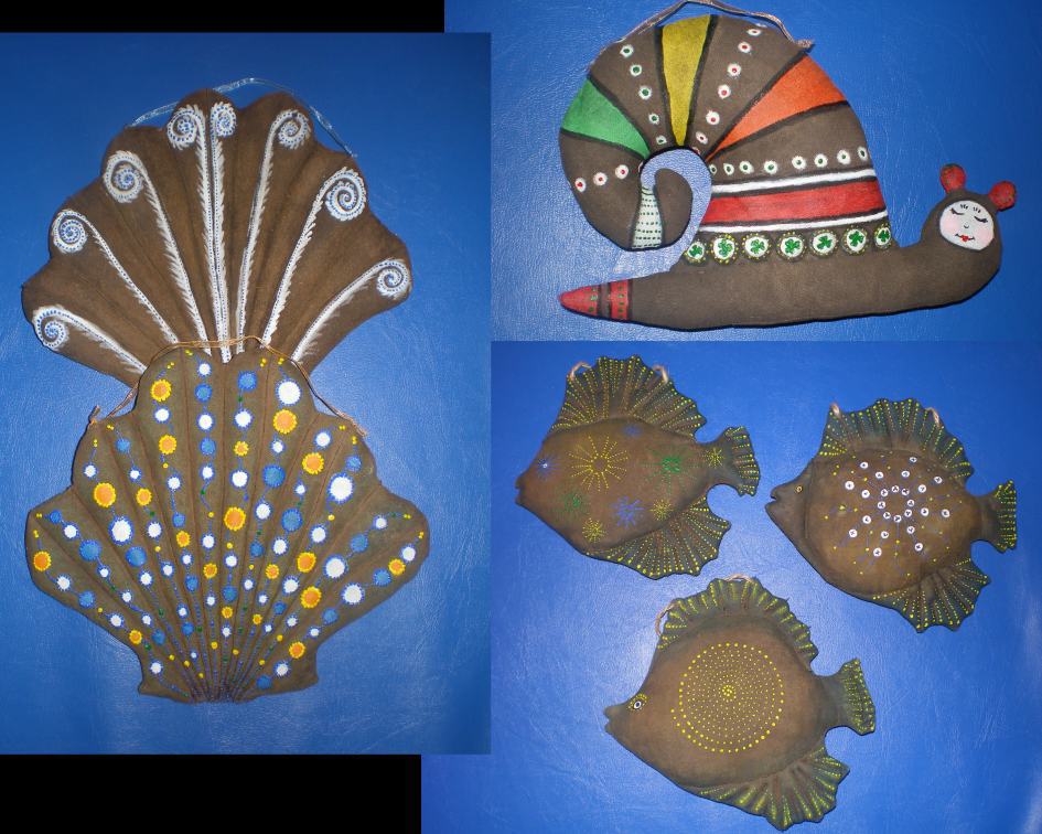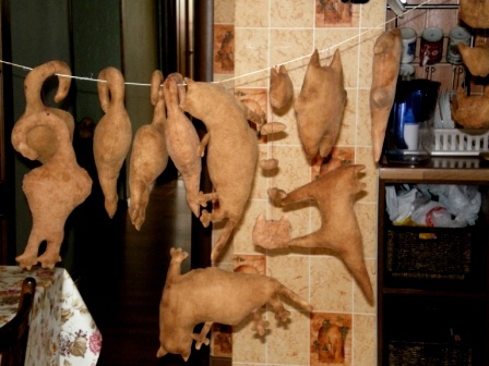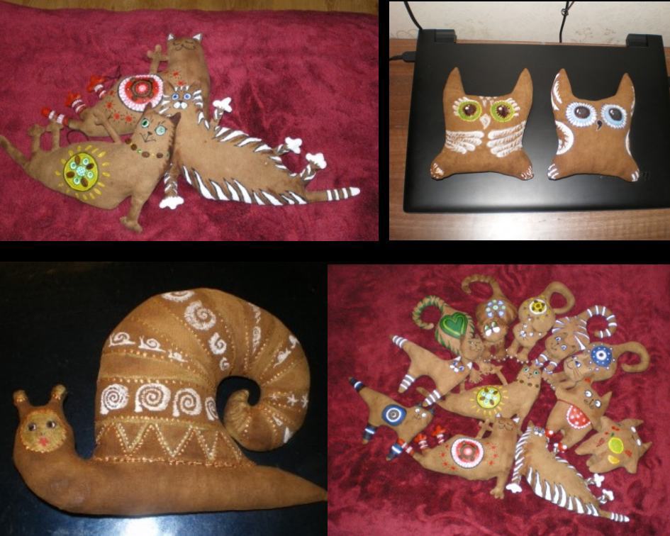Технология до безобразия проста: берется старая льняная простыня, из нее шьем кучу фигур, можно совсем простых, набиваем их синтепоном, макаем в раствор дешевого кофе (можно любой краситель, но у кофе цвет вкуснее и пахнет обалденно), сушим, расписываем. Я использую контуры по ткани, маркеры, штрих и еще что придется. Можно наклеить кофейные зернышки, бусинки итд. И - вуаля! Стотыщ подарков всем друзьям и родне на НГ и прочие праздники (не дарить же опять конфеты-шампусик-наборы-для-бритья в самом деле)))
