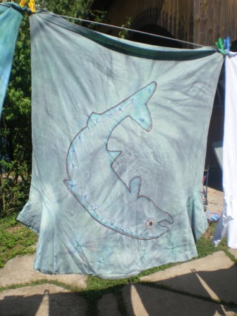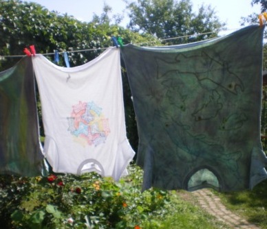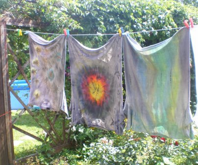 Для не умеющих толком рисовать оч хорошая вещь - узелковый батик: скручиваем ткань, заматываем ниткой, макаем в красящий раствор (или варим в нем) и получаем интересные разводы. Поверх можно еще что-нибудь нарисовать, фломастерами по ткани, например.