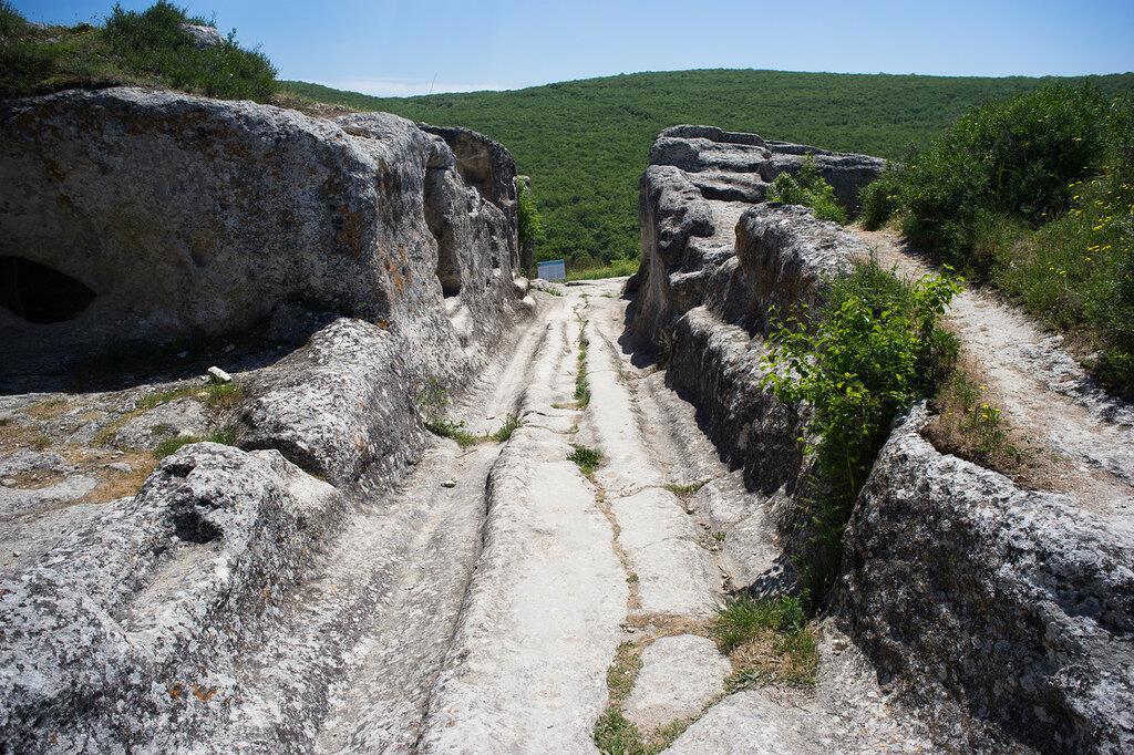И по стилю похоже, и по непонятности тоже. Не только на Эгиль. Я тут уже показывал странные «дороги», выбитые в камне в той же Турции, но не в Эгиле. Так вот в Крыму такие дороги с колеёй тоже есть. Вот одна такая, например: