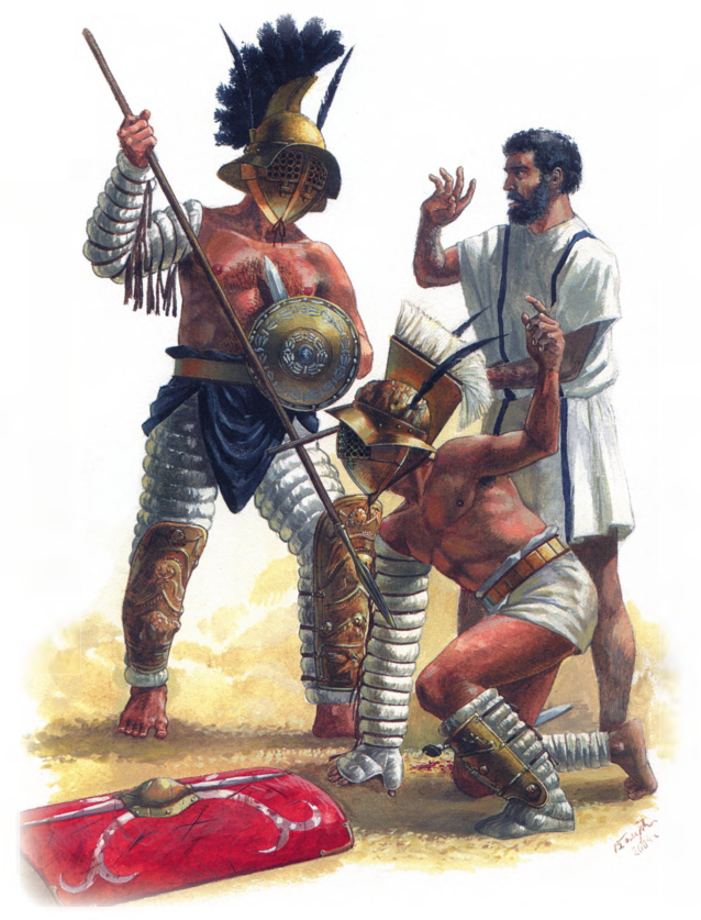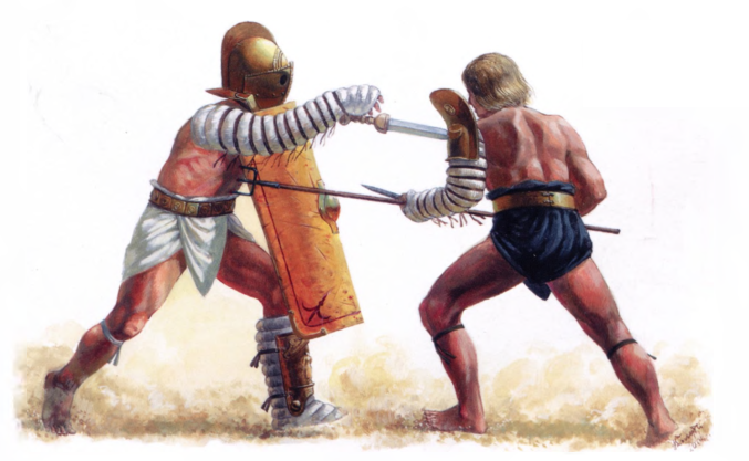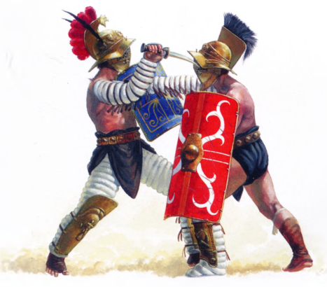Начнём с классики. «Фракиец» против мирмиллона (почему «фракиец» в кавычках надо пояснять?). Мирмиллон слева. «Фракиец» справа.