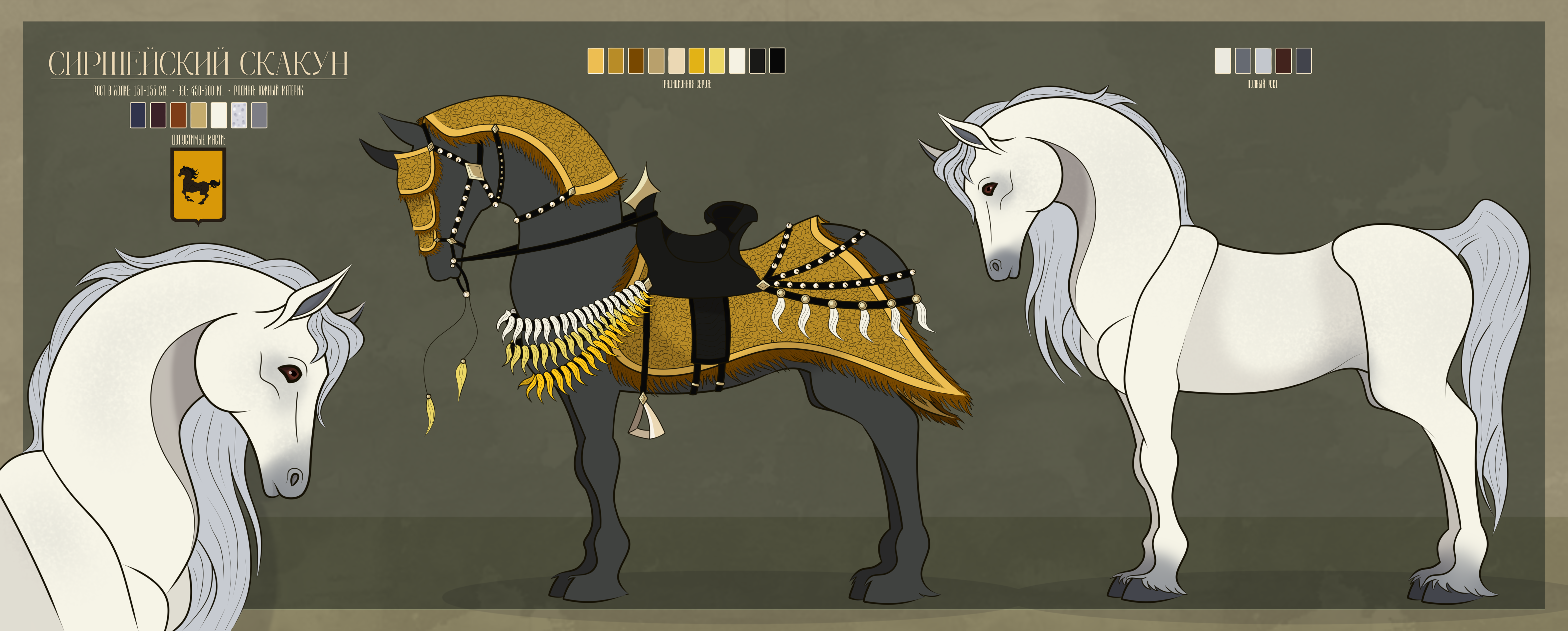 Автор: EllardСИРШЕЙСКИЙ СКАКУН – быстрейшая и красивейшая лошадь Южного Материка, проверенная в скачках на лучших ипподромах Сиршея. Впрочем, не только для скачек пригодны эти благородные звери. Всадники Южного Материка верхом на этих скакунах бесстрашно бросаются в бой даже с налетчиками мау-ррат и их кошками.