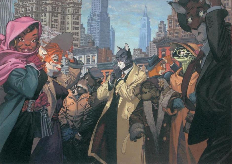 Джон Блэксад настоящий кот-детектив. Он живёт в мире антроморфных зверей, смахивающих на идеализированные версии от д-ра Моро, а не на модных фурри. За окном офиса небо протыкают небоскрёбы Нью-Йорка, проезжают авто с плавниками, кое-где вовсю играет рок-н-ролл, хотя через всю историю плавно течёт блюз. Тут случилась Вторая Мировая, имелся Гитлер со своими ублюдками, вовсю начинается охота на красных ведьм, мафия имеет различные лица, Ку-Клукс-Клан цветёт да пахнет даже в эдаком мире, а женщины, как и водится в как-бы крутых детективах сногсшибательны, страстны, смертельно опасны и донельзя женственно-сексуальны.