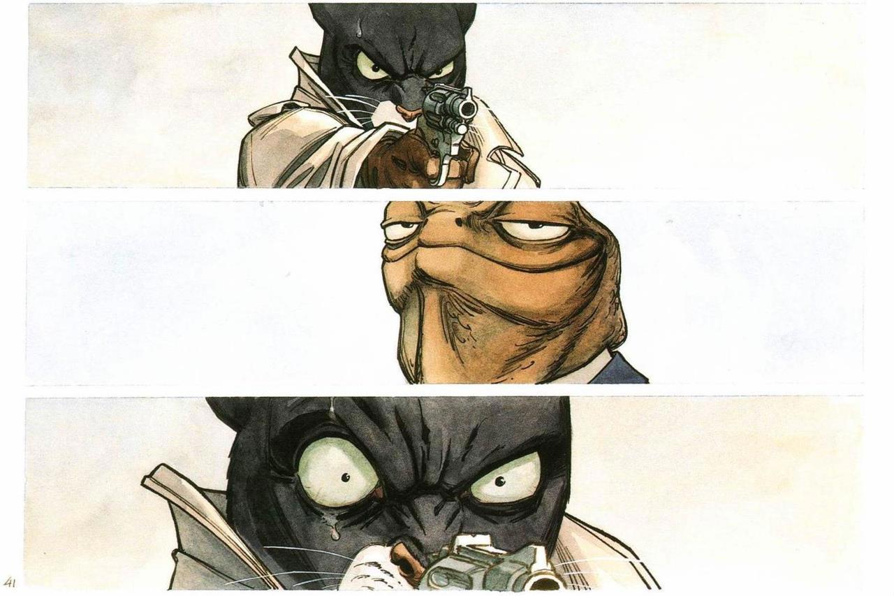Блэксад, кот-детектив, гоняющий на прекрасных авто, носящий плащ Коломбо, дружащий с суровым немецким овчаром-комиссаром, дружащий с лаской-репортёром и встречающий на своём пути персонажей, временами дивно и дико напоминающих героев с героинями фильмов Тарантино, чудесен. Персонаж, за чьи похождения не стыдно и не жалко заплатить, желая видеть в бумаге на своих полках.