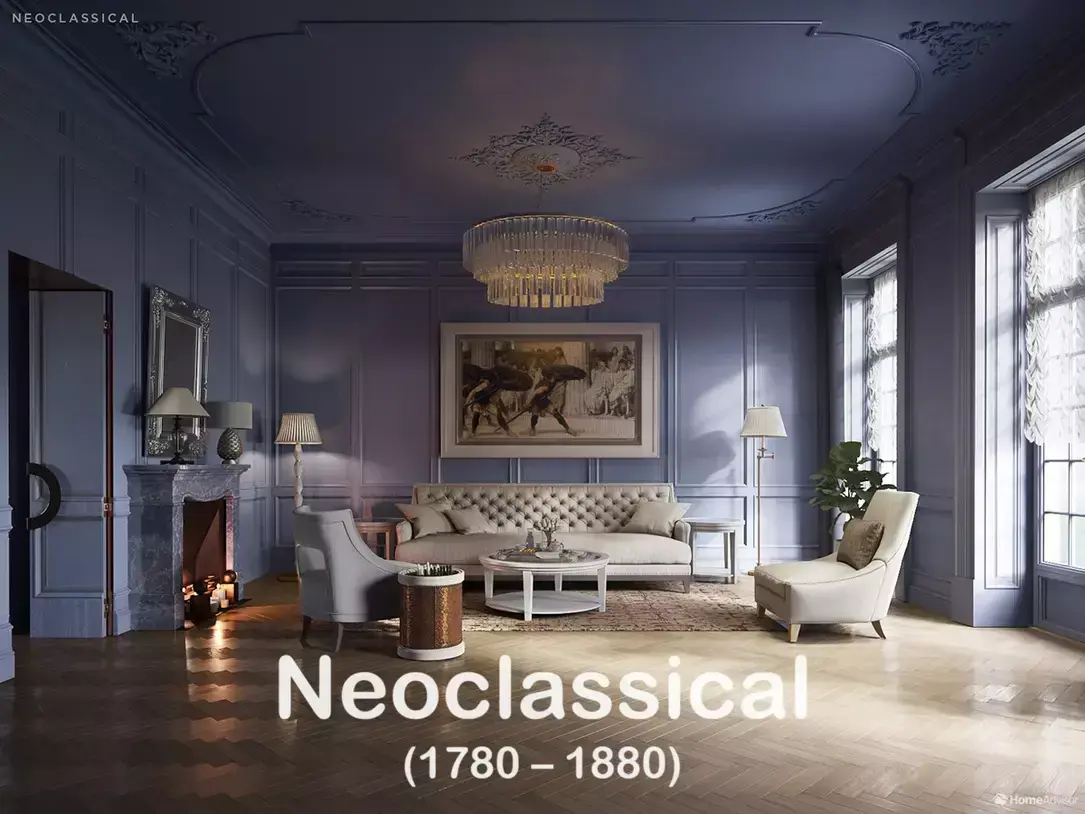 Обратите внимание на прямые линии нашей гостиной в неоклассическом стиле и логичную, почти математическую планировку. Художники, обучающиеся во Французской академии в Риме, распространили эти принципы дизайна по всей Европе. Обратите внимание на колоннообразную форму камина, светильников и панелей. Цвета были мягкими и не драматичными. Простой вкус подчеркивал стоическое, превосходное чувство формы, воплощенное в неоклассическом стиле".