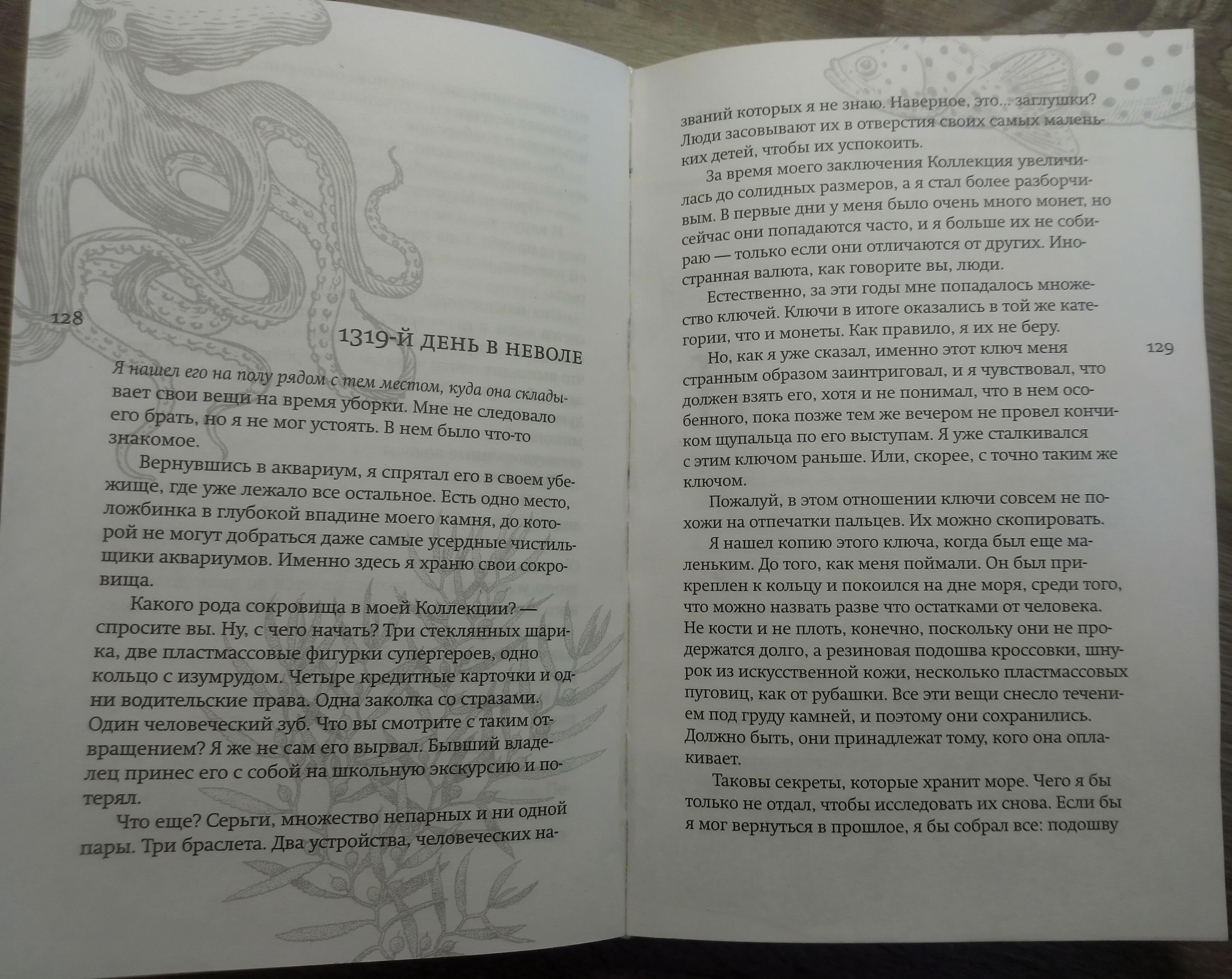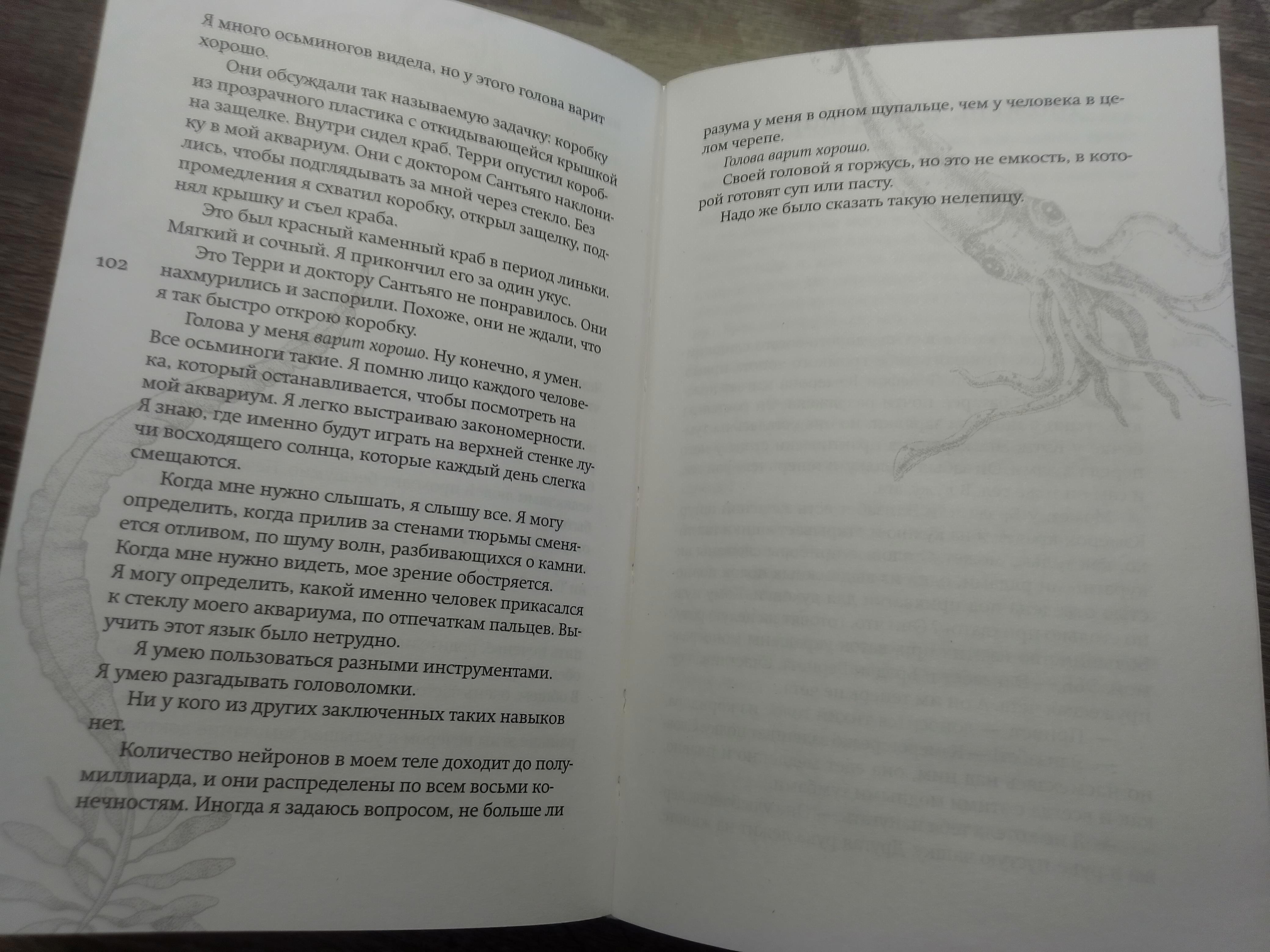 Отдельные главки написаны от лица осьминога, они и смешные, и грустные, хотя поначалу у меня было много вопросов. Осьминог научился читать — каким образом? Он знает значение слов «генетическое родство», «фамилия», «бюрократия» — и как бы он узнал? Он чувствует запахи — но ведь у головоногих нет обоняния?