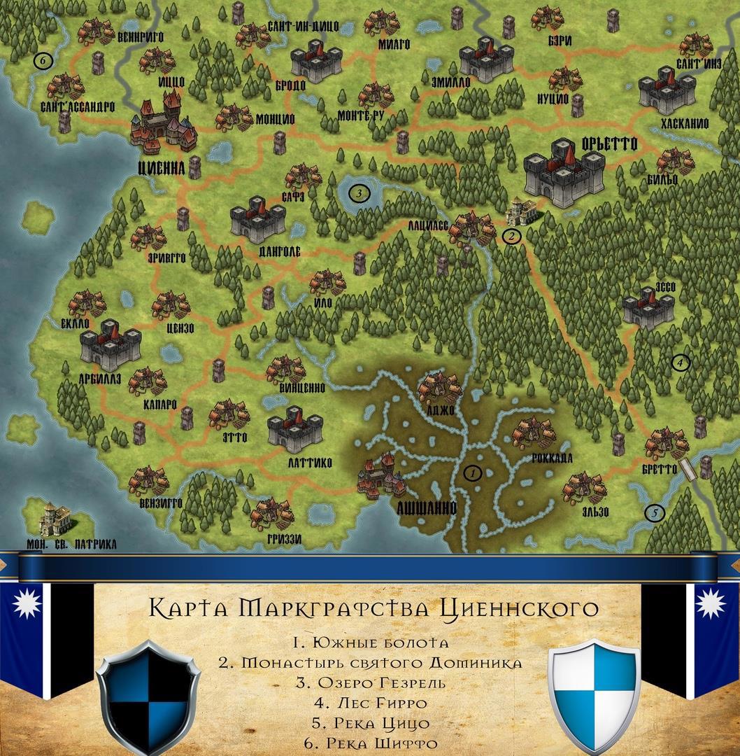 Маркграфство Циенна - средних размеров владение, которым правит маркграф Готфрид. Входит в состав исполинской Праведной Империи Герементов. Страну долгое время раздирало противостояние между феодалом и Церковью с одной стороны, и зажиточным купечеством и республиканцами с другой. Конфликт удалось практически разрешить миром, но часть радикалов продолжили войну. До сих пор как минимум треть маркграфства удерживается силами идей республики - на болотах и в лесах они продолжают сражаться за всем известные вольности. С этих пор дороги маркграфства заполонили монстры и ожившие мертвецы. Циенна - богатый торговый город, где могущественные торговцы из Гильдии и муниципальные магистры живут в свободе и воле, получая огромную прибыль. В остальном страна представляет владения, поделённые между вассалами Готфрида. Империя раз в три года собирает налоги и рекрутирует в имперское войско новобранцев.